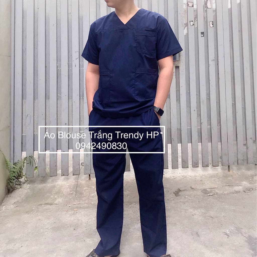 Hình chụp thật 100% Bộ scrubs nam nữ màu xanh đen - bộ quần áo blouse cổ tim bác sĩ, hộ lý, kỹ thuật viên màu xanh đen