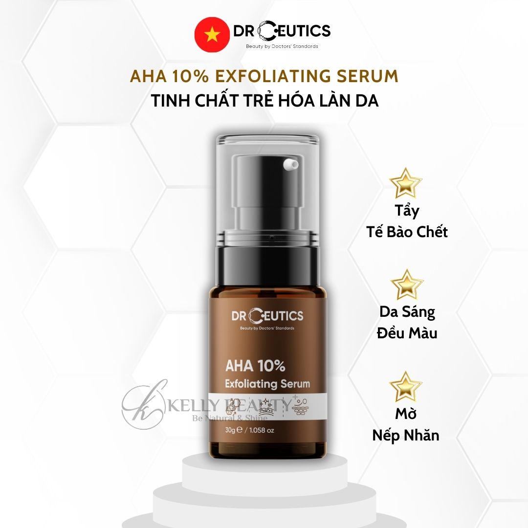 - DrCeutics AHA 10% Exfoliating Serum giúp làm sạch tế bào chết, giúp thông thoáng lỗ chân lông, làm sạch bã nhờn dư thừa, giúp da láng mượt, mịn màng, cải thiện tình trạng nếp nhăn, làm mờ các vết thâm – sạm