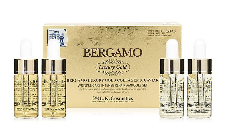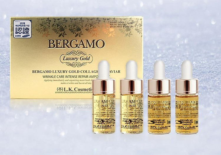 + Siêu tinh chất Bergamo Luxury Gold bergamo caviar wrinkle care intense repair ampoule (chai vàng đậm ): có tác dụng hỗ trợ trị mụn cám, mụn đầu đen, se khít lỗ chân lông, dưỡng mịn da, làm da căng bóng.