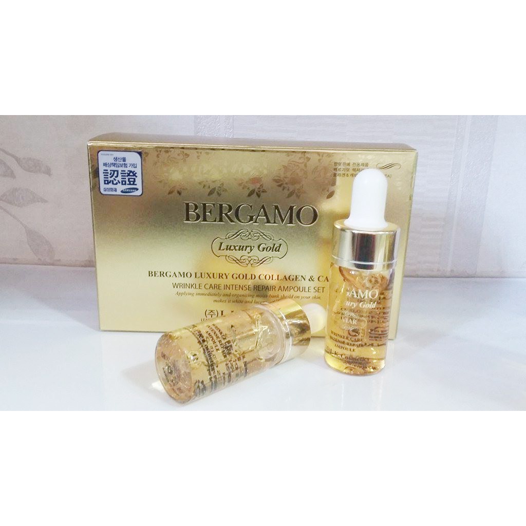 Serum Bergamo Luxury Gold 13ml Xuất sứ: Hàn Quốc Thưoưng hiệu: Bergamo Dung tích: 13ml ------------------------------------------- - Serum BERGAMO Luxury Gold được tạo thành từ một công thức mới độc đáo với tinh chất collagen, tinh thể vàng và trứng cá tầm nuôi dưỡng và làm trắng da, phục hồi da tổn thương, sẹo do mụn để lại.