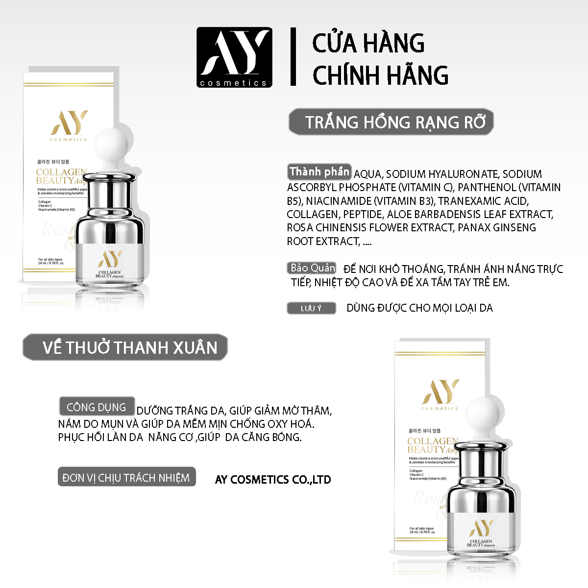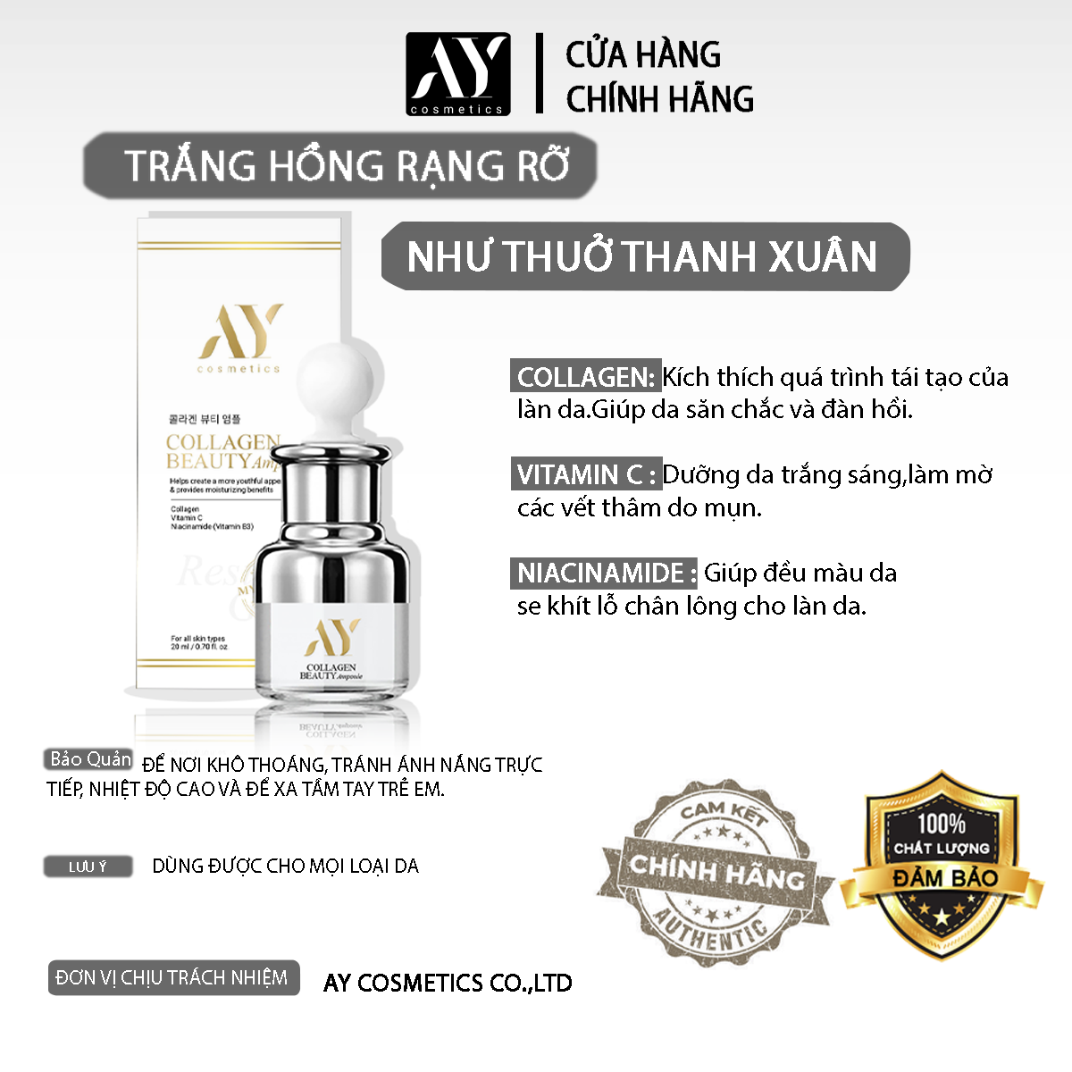- Tăng sinh COLLAGEN,ngăn ngừ a l ão ho á,giúp da săn chắc,đàn hồi,hạn chế dầu nhờn,s e khít l ỗ chân l ông,dưỡng trắng, dưỡng sáng,giảm thâm ,n áống ôxy hoá.