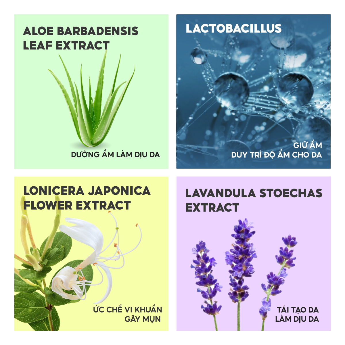 - Chiết Xuất Hoa Kim Ngân, Hoa Oải Hương với đặc tính kháng khuẩn và chống viêm giúp ngăn ngừa mụn, làm dịu da.