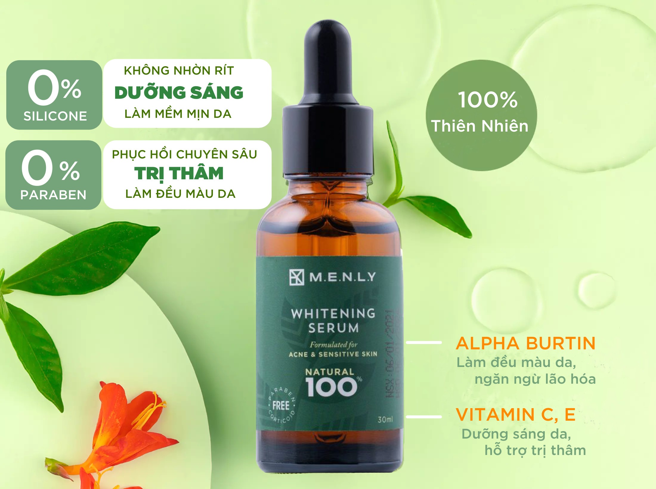 Công dụng: Serum dưỡng sáng da MENLY sẽ khôi phục tổn thương và tạo lớp màng bảo vệ da. Nuôi dưỡng làn da mịn màng và đều màu, dưỡng trắng sáng chỉ sau 14 ngày sử dụng.