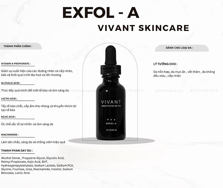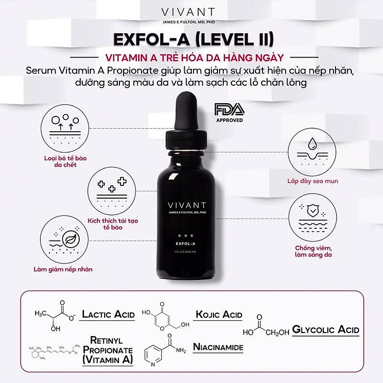 Với công thức Vitamin A riêng biệt đã được cấp bằng sáng chế của Vivant giúp giúp loại bỏ các tế bào da chết, kích thích tái tạo tế bào mới, giúp giảm nếp nhăn, sẹo mụn và quá trình gia tăng sắc tố với sự kết hợp mạnh mẽ của các thành phần chống oxy hóa, chống viêm và làm sáng da. Vivant Skin Care Exfol-A cung cấp cho làn da của bạn một lượng Vitamin A hàng ngày để chống lại các dấu hiệu lão hóa rõ rệt. Nhờ đó mà serum làm trẻ hóa và mang lại cho làn da dễ bị mụn trứng cá một kết cấu mịn màng vì nó tăng cường tái tạo tế bào để tăng độ săn chắc.