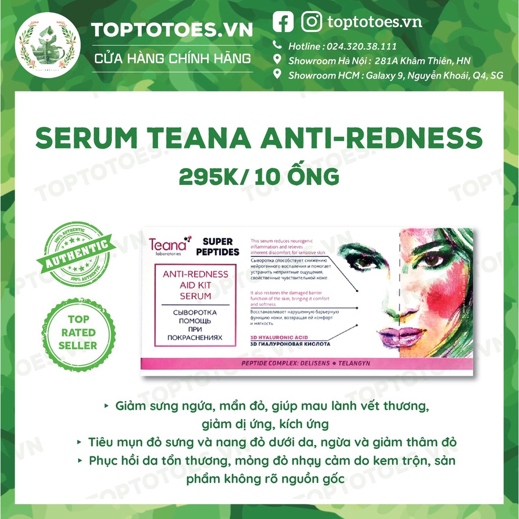 1. Serum Teana Super Peptides Anti-redness Aid Kit giảm sưng, mẩn đỏ, mụn, phục hồi da🌡 • Với bảng tp chủ đạo là các peptides (xứng đáng với một cái giá cao hơn rất nhiều), hiệu quả cao, nguy cơ kích ứng thấp, No Problem và Antiredness có thể coi là đột phá mới siêu hiệu quả trong việc hỗ trợ giảm nhanh các thể mụn nặng. Và cũng vì bảng thành phần không liên quan nên các bạn không hợp B3 B4 vẫn có thể dùng Antiredness/ No problem và ngược lại nhé🥰. _______________ Serum cực hiệu quả trong việc: - Giảm mẩn đỏ, tiêu mụn sưng, tiêu nang đỏ dưới da (vốn nang đỏ dưới da cực mất thời gian giảm, còn khó hơn mụn), giảm thâm đỏ. - Giảm sưng, phục hồi da mụn, mỏng, yếu, nhạy cảm, da tổn thương sau khi dùng kem trộn, sản phẩm không rõ nguồn gốc. - Làm dịu da, giảm triệu chứng kích ứng, dị ứng, giúp mau lành vết thương, phục hồi da sau nặn mụn. ► Em ấy đặc biệt phù hợp với các bạn da mụn sưng, mẩn đỏ, nhạy cảm. Nếu da bạn nào còn yếu và nhiều mụn đỏ, đừng vội vã dùng các loại treatment nặng đô hay lao đi nặn mụn, mọi chuyện có thể sẽ tệ hơn nhiều😭. Kiên trì dùng vài ống Teana Antiredness thôi, da ổn định hẳn ấy, lúc ấy thì mới tiến lên các hướng cải thiện khác các c nhé🥰. Em này còn giảm thâm đỏ đỉnh cực kì, kết hợp ngừa mụn tái phát và hồi phục da luôn, nên nhiều bạn khỏi mụn rồi mà vẫn mua đi mua lại🤣