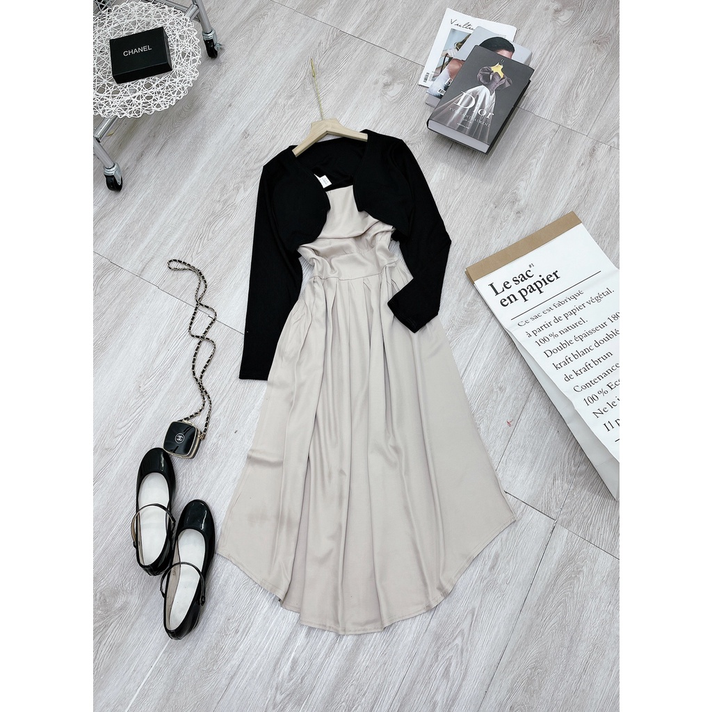 Giới thiệu Set 2 món cardigan thiết kế váy 2 dây xòe áo khoác ngoài dài tay DN543