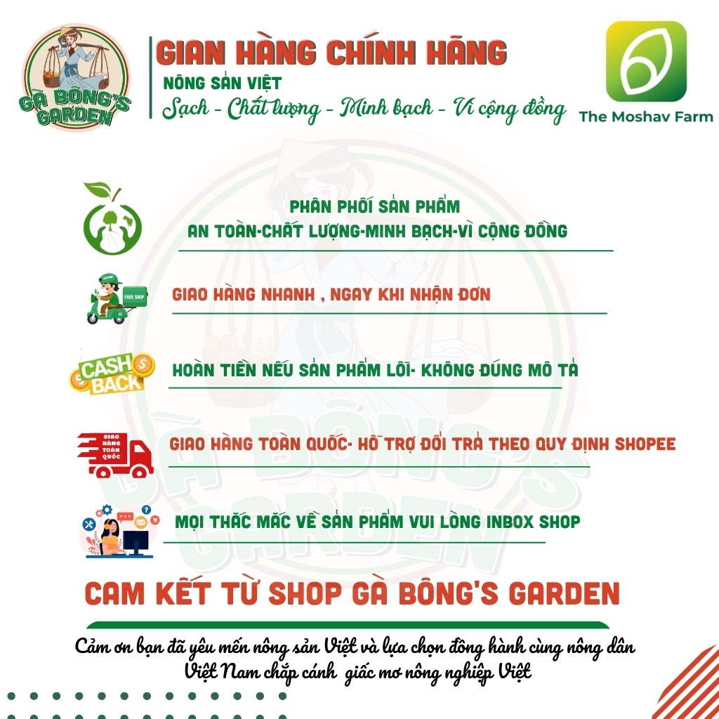Gà bông's Garden- Kênh phân phối chính hãng các sản phẩm The Moshav Farm. Shop lựa chọn sản phẩm từ nông sản Việt chất lượng, an toàn để đồng hành cùng bà con nông dân và thương hiệu Việt. Cảm ơn bạn vì đã góp phần giải quyết đầu ra cho nông sản Việt. Vì một tương lai nông sản sạch- thực phẩm xanh- nông nghiệp Việt vươn tầm thế giới!