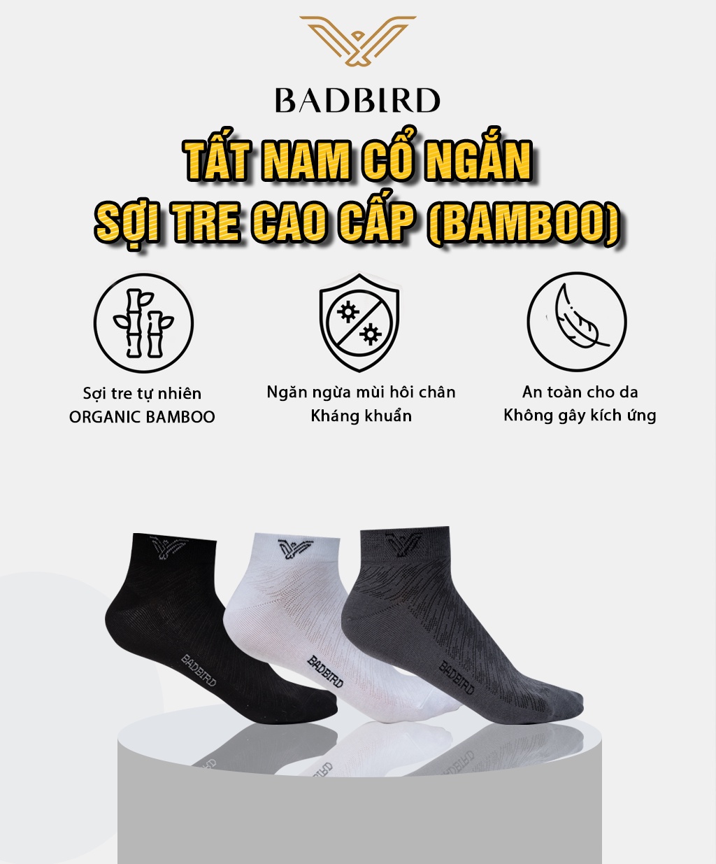 - Chất liệu sợi tre cao cấp mang đến một dòng tất nam cổ ngắn có những ưu điểm rất lớn như thân thiện với da, thấm hút, kháng khuẩn tốt, ngăn ngừa mùi hôi chân.