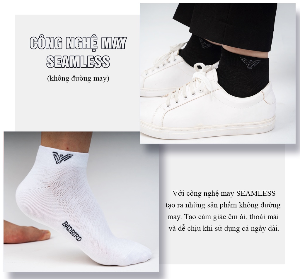 - Công nghệ không đường may SEAMLESS tiên tiến nhất thế giới tạo nên những đôi tất nam cổ ngắn không đường may, không gây hằn, kích ứng lên da.