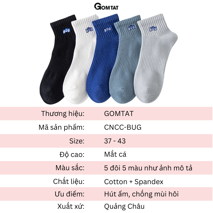 Set 5 đôi tất vớ nam cổ ngắn GOMTAT cao cấp mẫu Bug, chất liệu cotton mềm mại thoáng mát cực êm chân - CNCC-BUG: loại Vớ Nam Cổ Ngắn với tone màu nhẹ nhàng rất dễ để phối với giày thể thao, hoặc giày tây công sở, chất liệu cotton khử mùi thoáng khí, êm ái khi sử dụng.