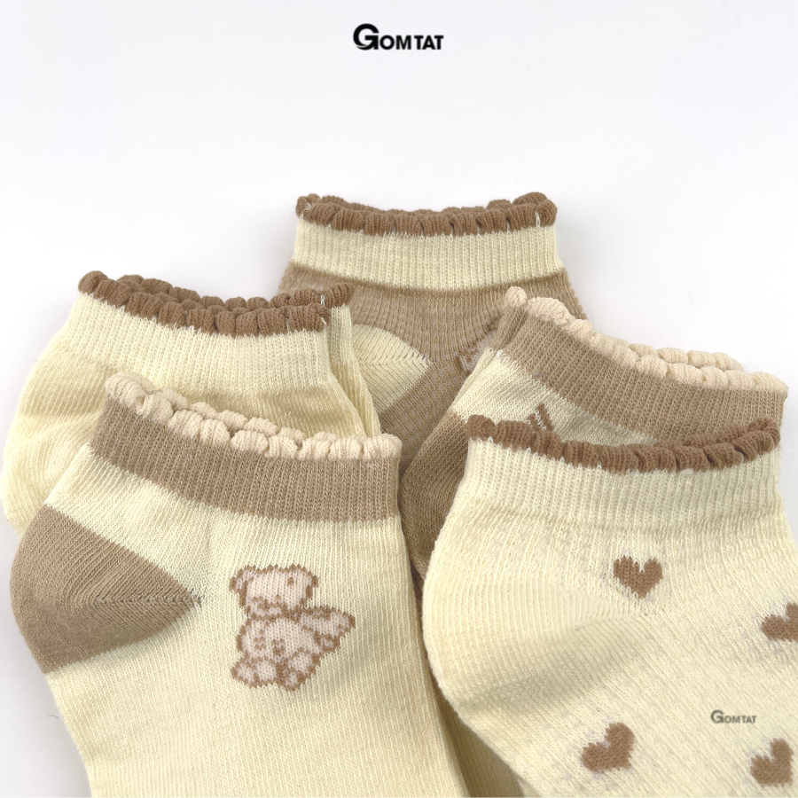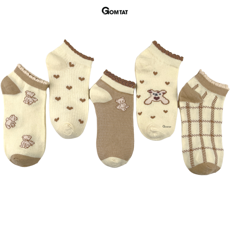 Set 5 đôi vớ nữ cổ ngắn GOMTAT họa tiết màu nâu dễ thương, chất liệu mềm mỏng thoáng mát, êm chân - CB086: loại Vớ Cổ Ngắn với tone màu nhẹ nhàng rất dễ để phối với giày thể thao, hoặc giày tây công sở, chất liệu cotton khử mùi thoáng khí, êm ái khi sử dụng.