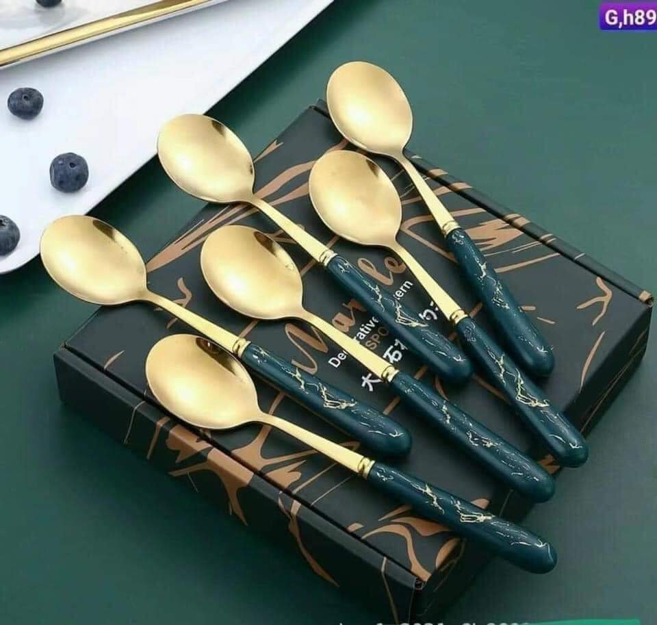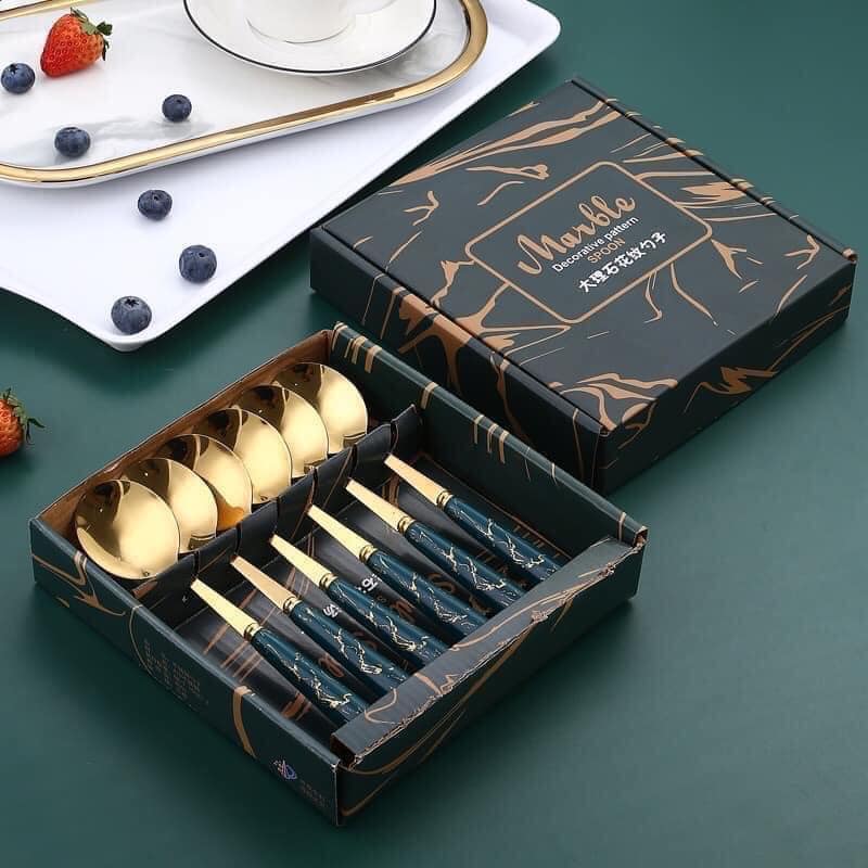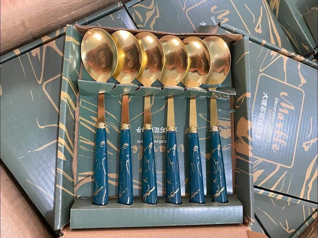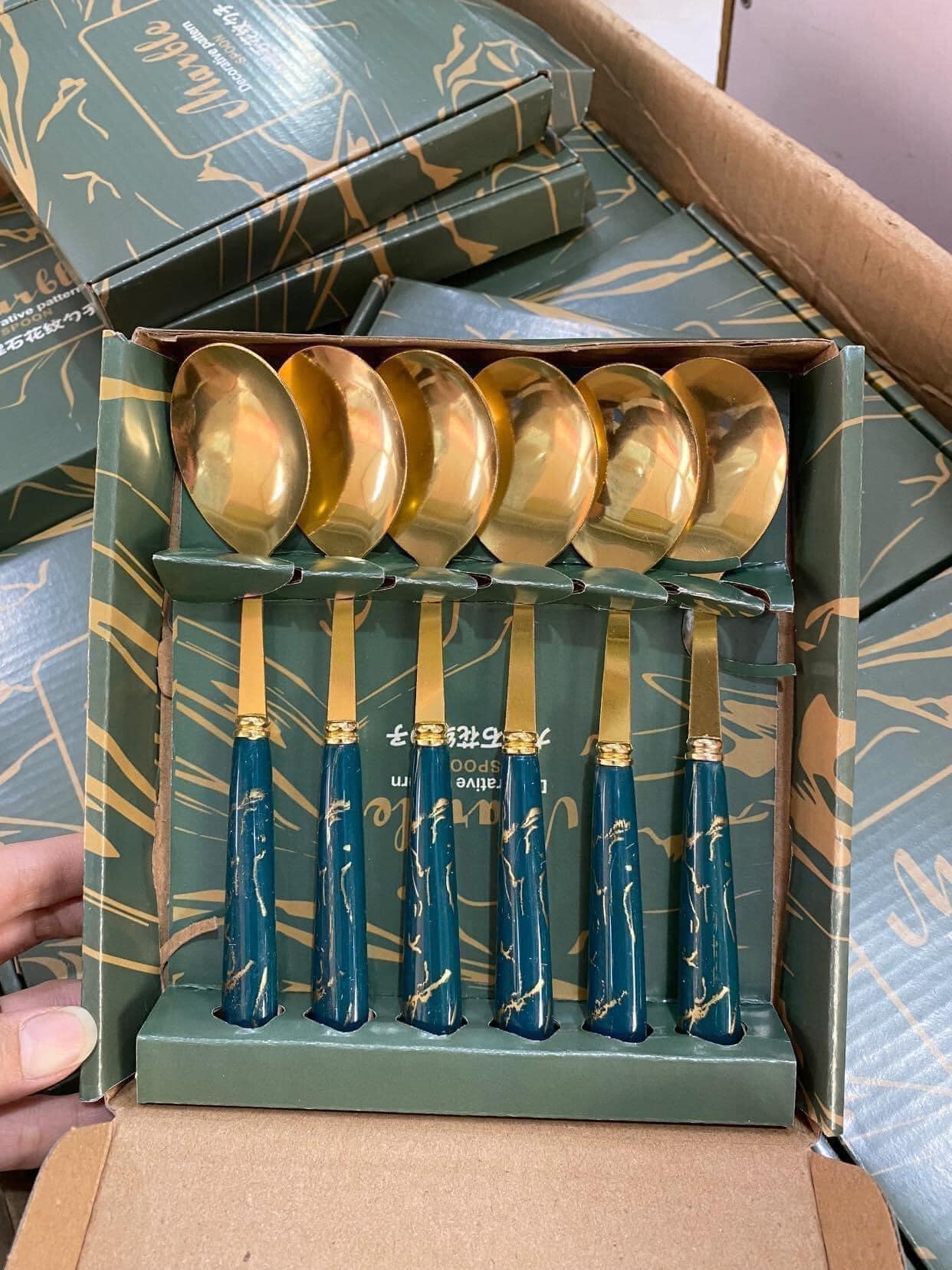 SÉT 6 THÌA TRÚC MẠ VÀNG CAO CẤP CÁN BẰNG ĐÁ XANH CẨM THẠCH - HÀNG NHẬP KHẨU