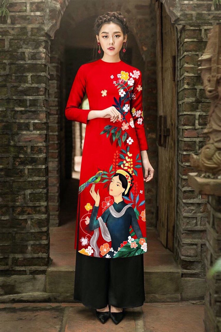 Set Áo Dài Truyền Thống Cổ Tròn Họa Tiết Cô Gái Kèm Quần