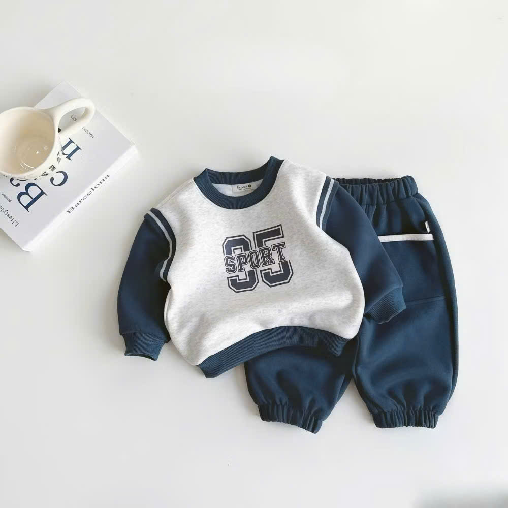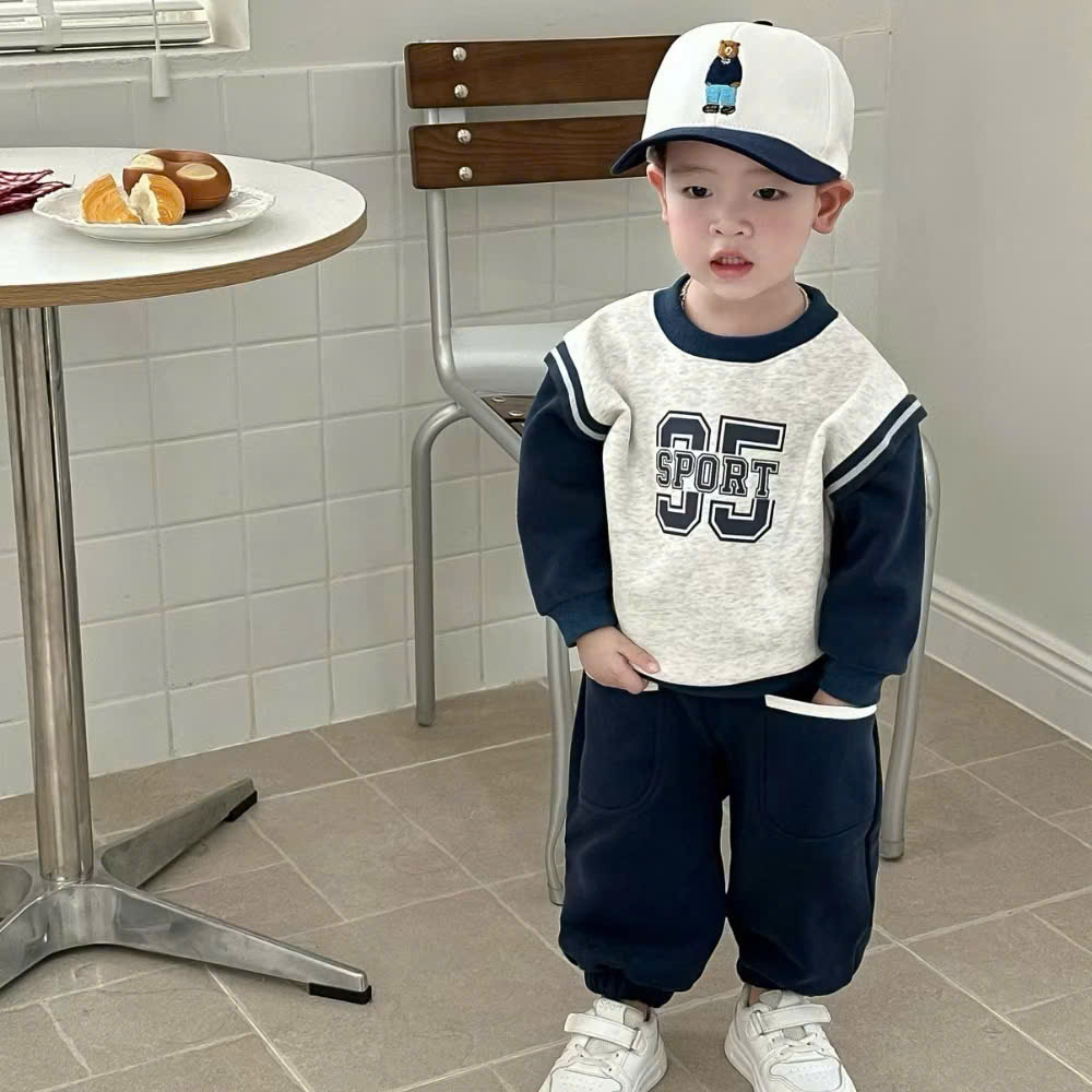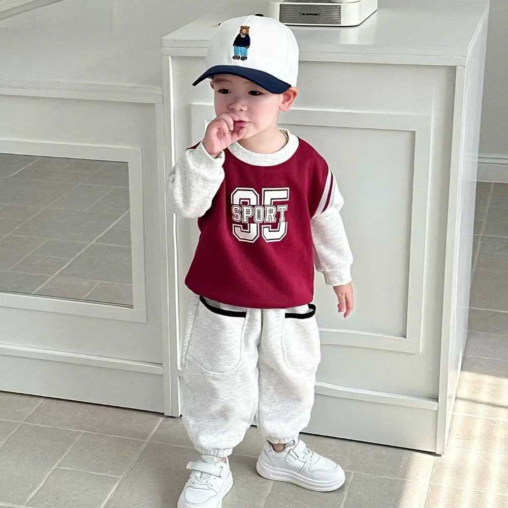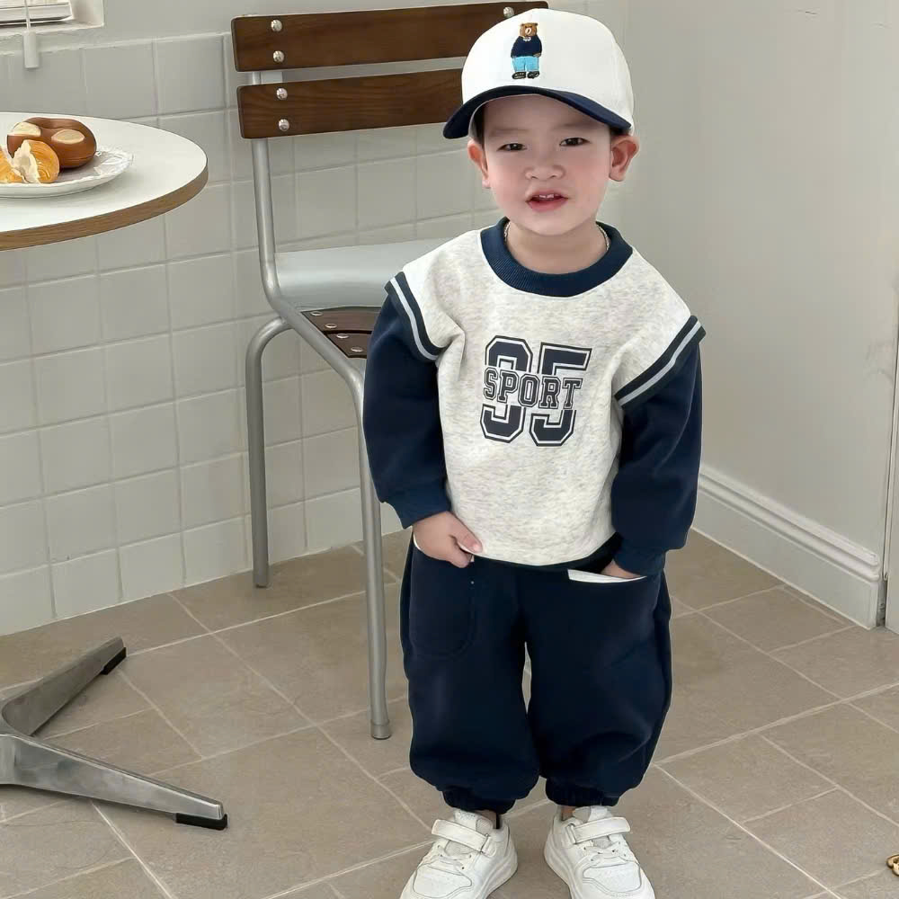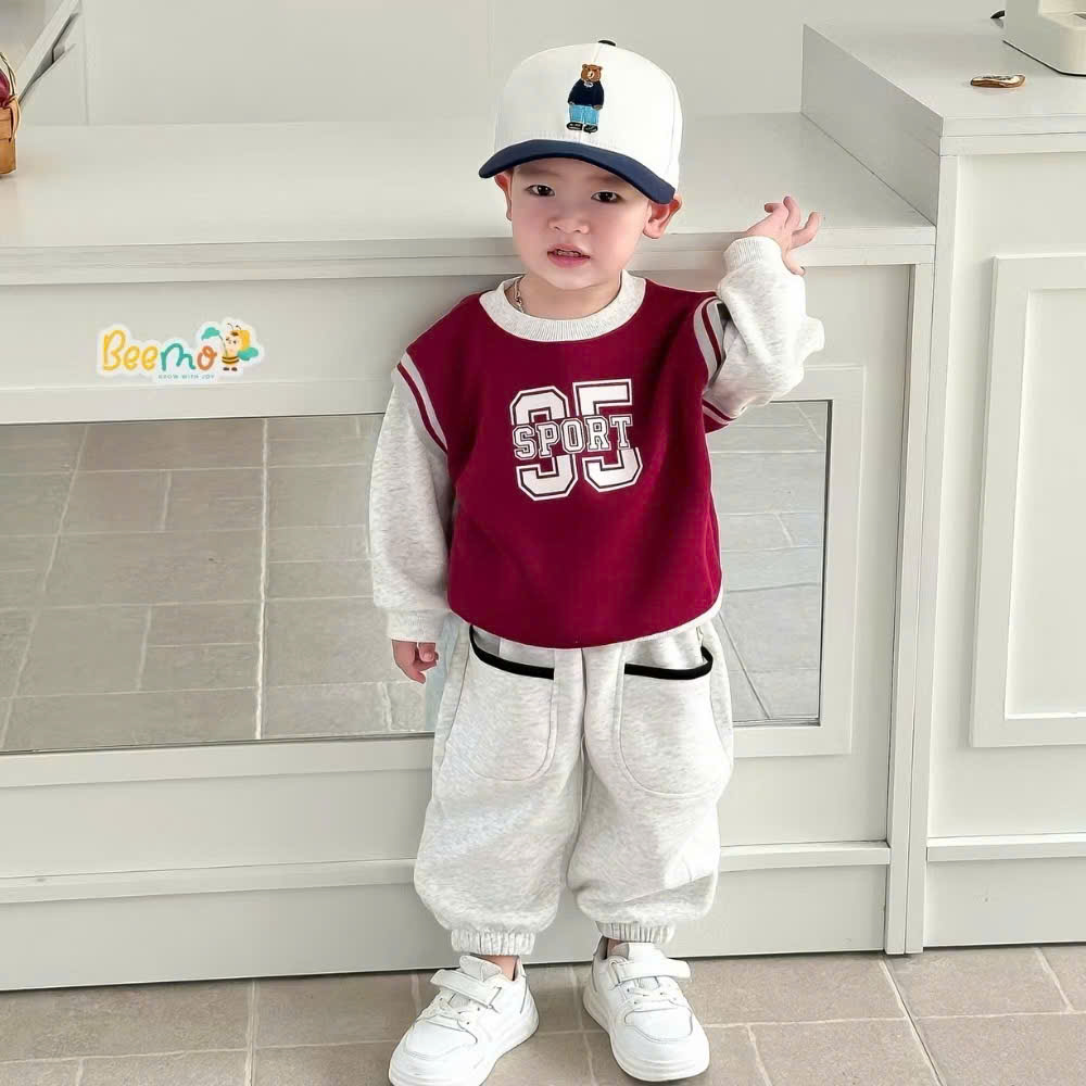 - Thiết kế set áo nỉ tay dài, quần dài bo ống phóng cách thể thao . Áo cổ tròn bo gân, form hơi rộng, tạo cảm giác thoải mái cho bé. Quần dài cạp chun mềm, ống bo gọn, có logo nhỏ đồng bộ với áo
