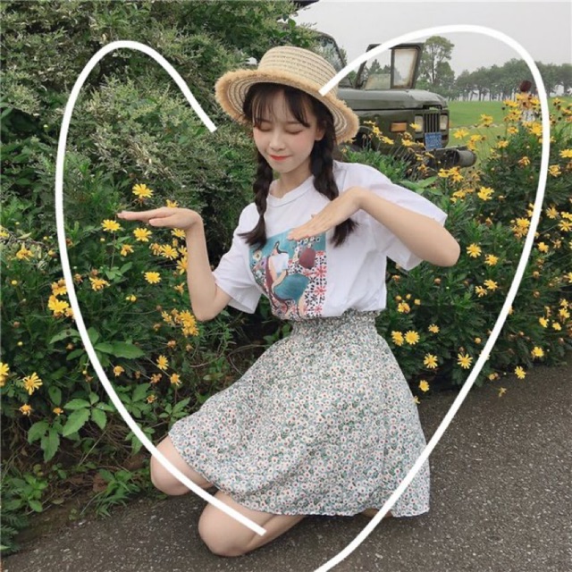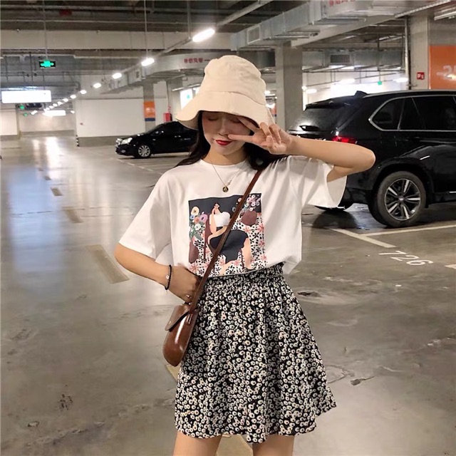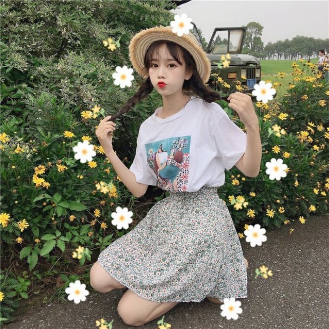 Set áo phông kèm chân váy xoè hoa nhí Ulzzang