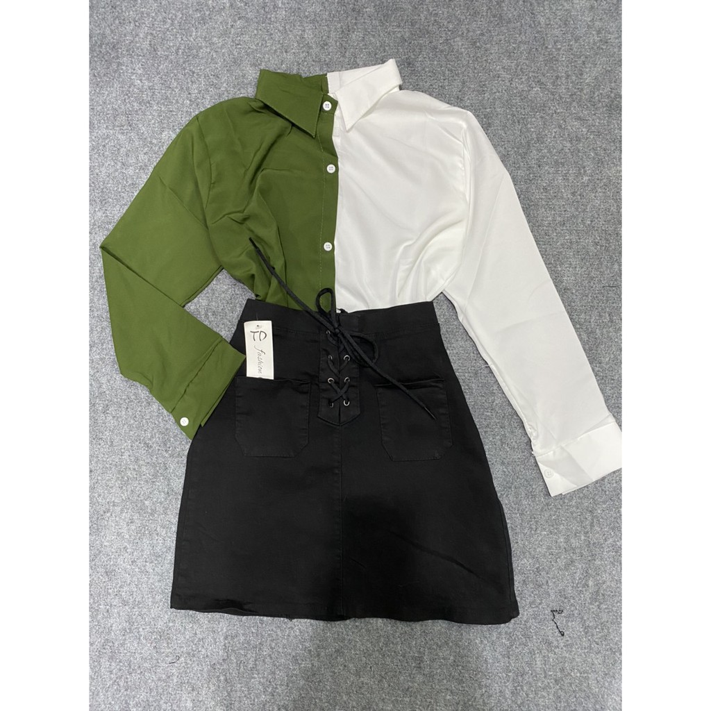Giới thiệu Set áo sơ mi phối màu phối chân váy đan dây giữa