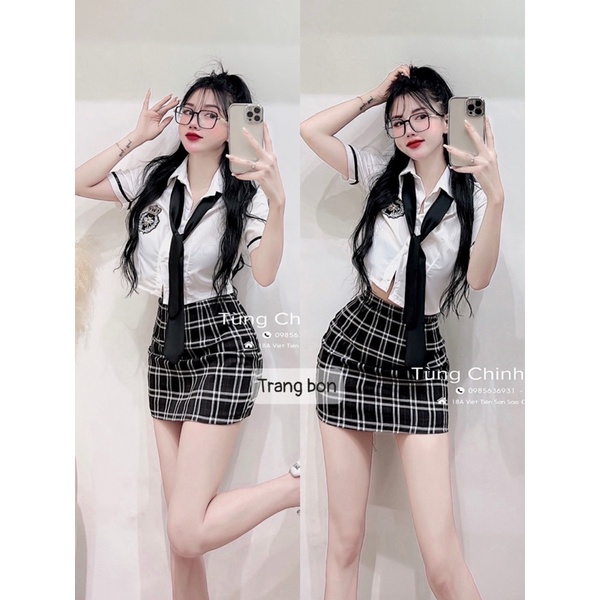 Set áo sơmi + chân váy kẻ kèm cà vạt
