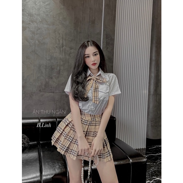 Set áo sơmi trắng + chân váy kẻ kèm nơ cổ