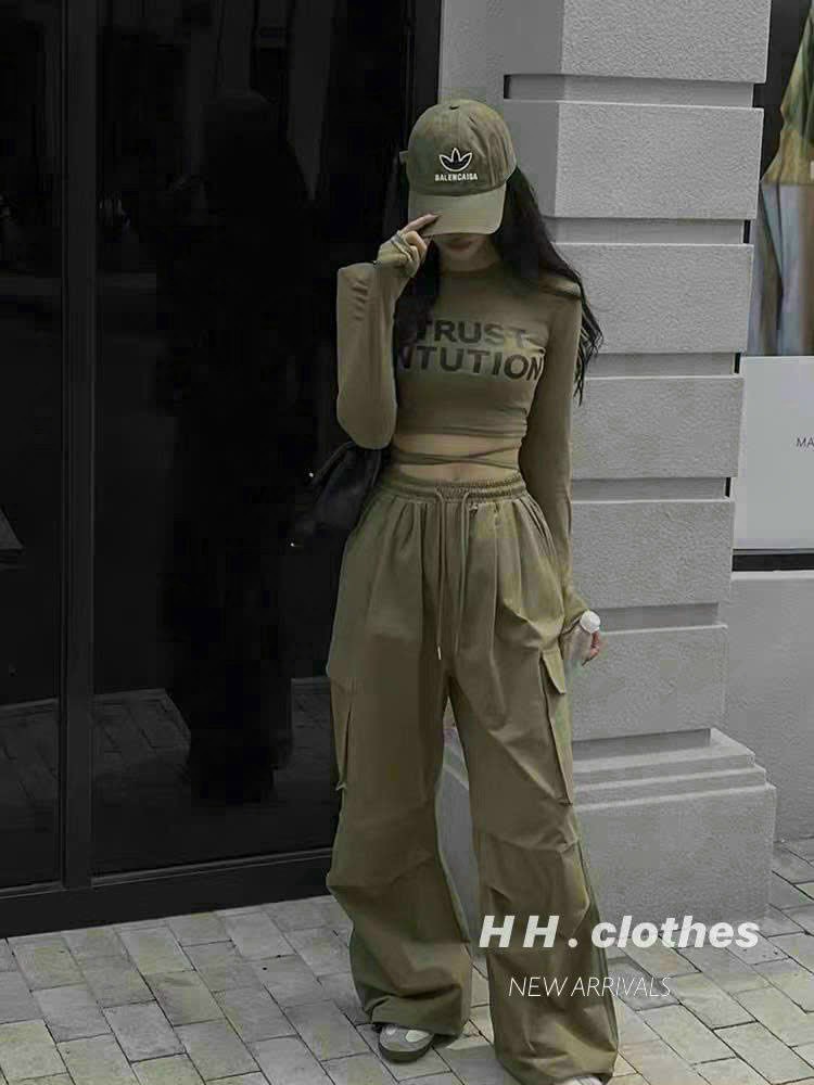 Set Áo Tay Dài Phối dây Quấn Quanh Eo In Chữ Nổi Ở Ngực Kèm Quần Túi Hộp Jogger