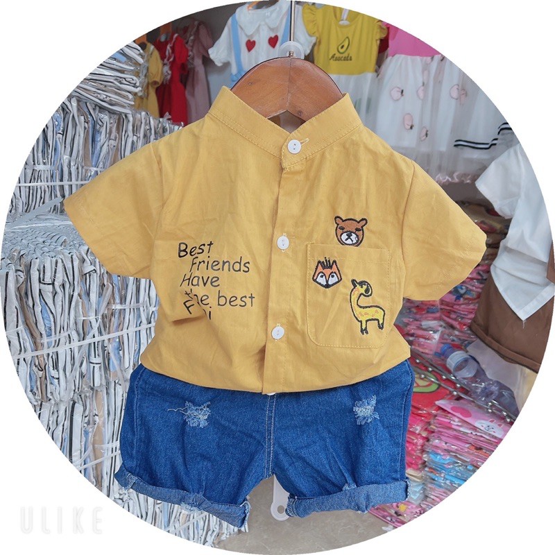 Thời trang trẻ em & trẻ sơ sinh > Quần áo bé trai > Quần > Quần ngắn || sét áo thêu gấu hươu kèm quần bò xanh cho bé