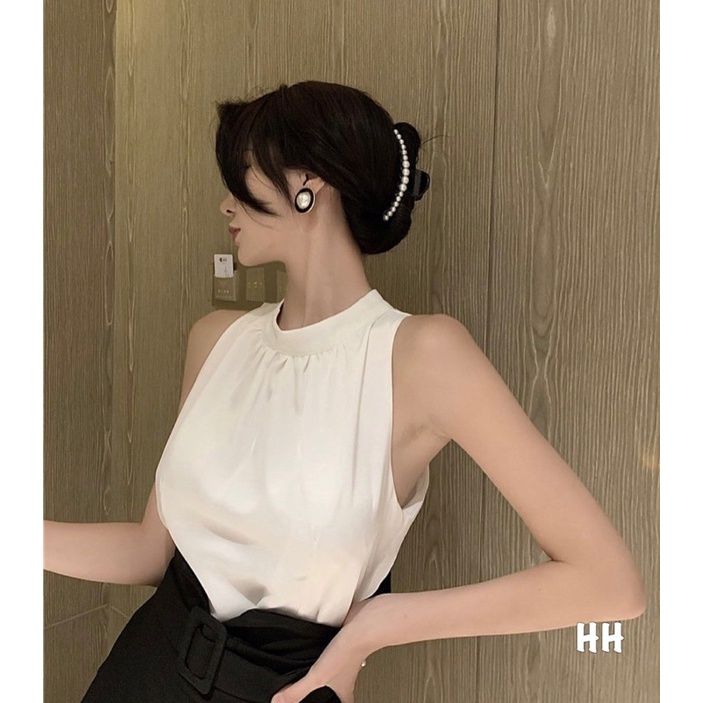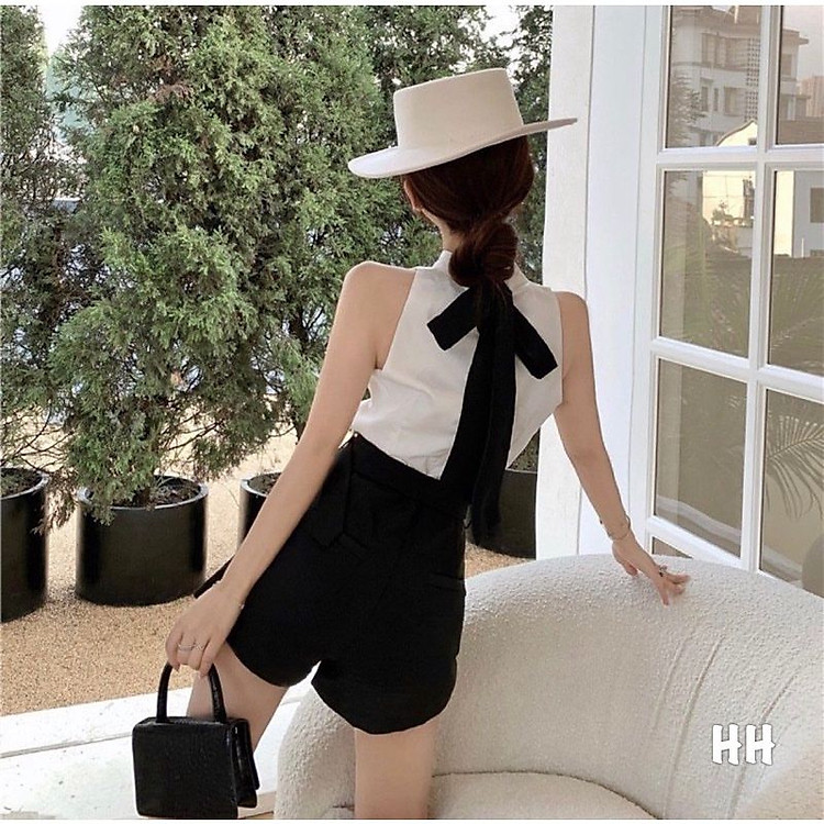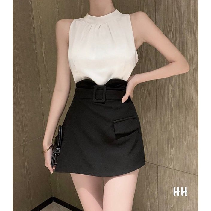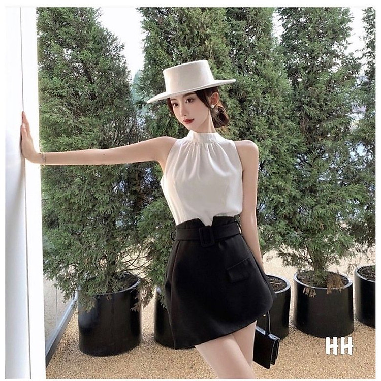 *Set áo trắng sát nách cổ yếm sooc đen kèm đai nữ SETN498