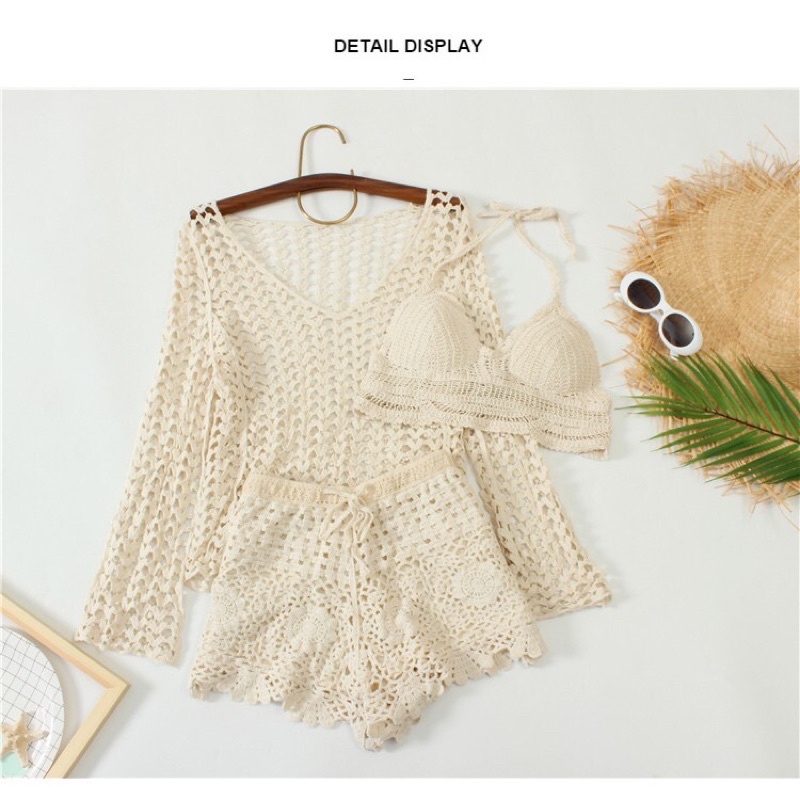 Giới thiệu Set bikini ren móc đi biển 3 món gồm choàng cổ tim-bra-quần sóc hoa