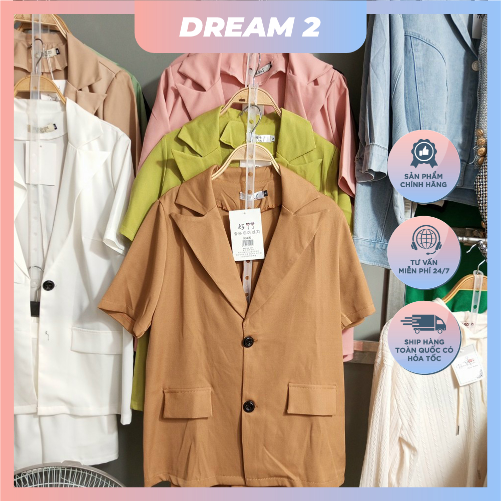- Áo Blazer dáng dài rộng, cộc tay, lá cổ 2 ve, 2 cúc cài