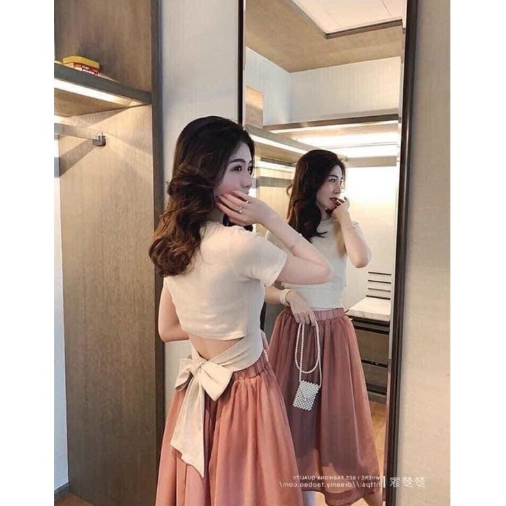 Set bộ áo cột nơ lưng_Chân váy voan Free Size dưới 52kg dành cho nữ