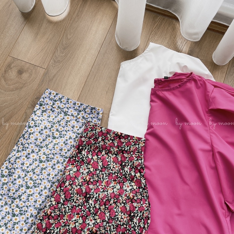 Set bộ áo sơmi tay bồng chân váy chữ A hồng BY MOON SN001