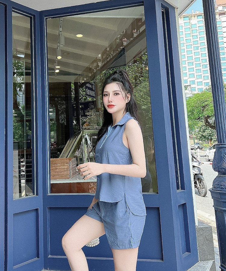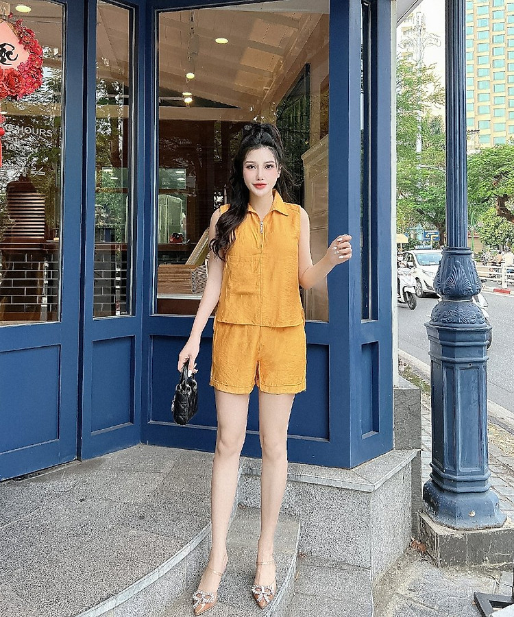 - Kiểu dáng: áo cổ sơ mi phối khóa kéo. Quần sort ngắn bản eo dây kéo phía trước, 2 túi sườn