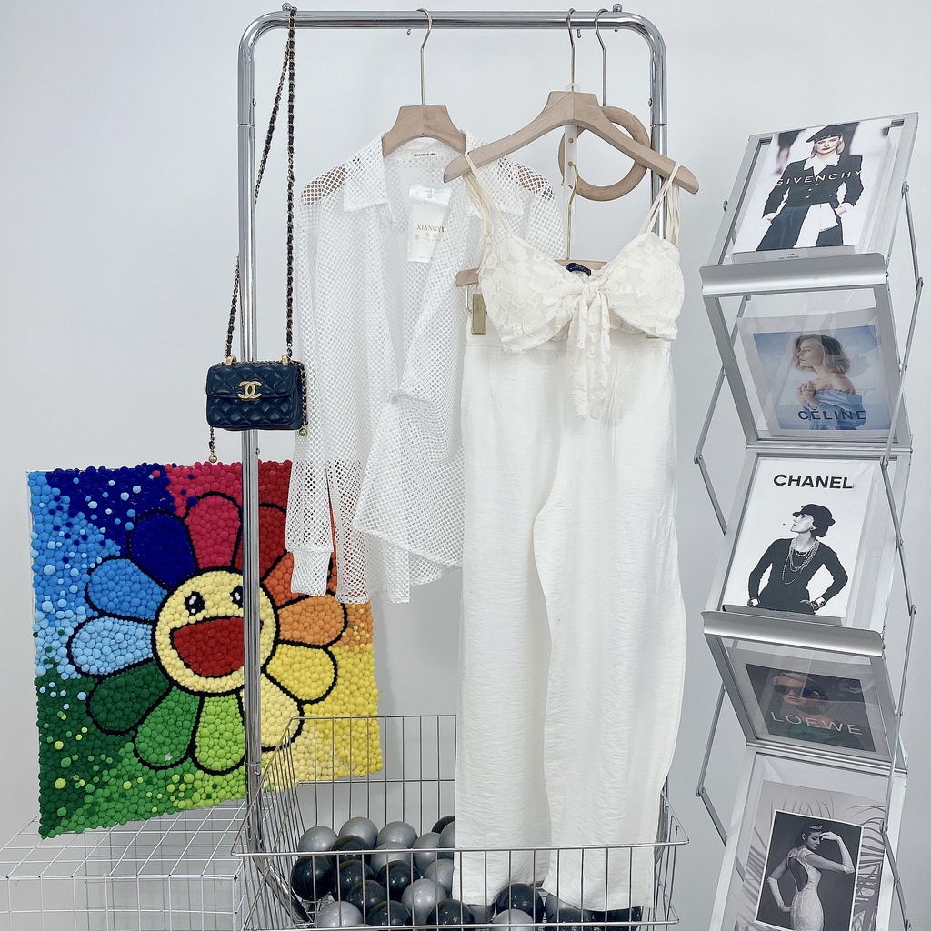 Giới thiệu Set bộ đi biển áo cardigan lưới kèm bra mix quần ống rộng BN955