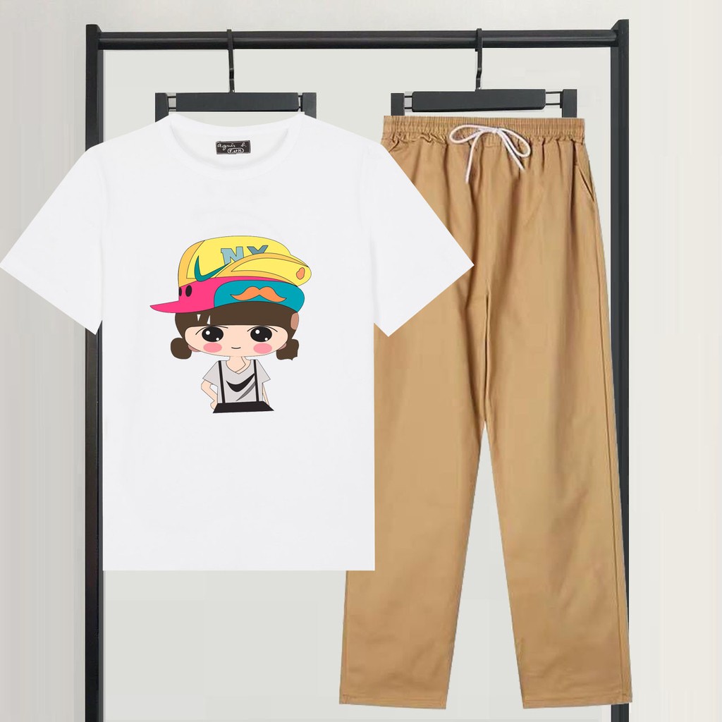 Giới thiệu Sét Bộ Đồ Nữ Mặc Đi Chơi Dạo Phố Ngắn Tay Mùa Hè, Áo Phông Cotton In Cô Gái Mũ Kèm Quần Jogger Kaki Phong Cách Hàn Quốc