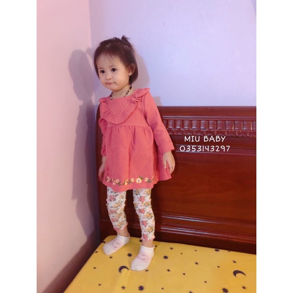 Set bộ hoa hồng dư xịn cực xinh, bé mặc lên dáng cute luôn ạ. Áo riềm cổ tiểu thư, có cúc sau lưng, viền áo chạy hàng hoa thêu nổi bật. Quần hoa chất cotton tăm mềm co giãn mặc cực thích. Set này chuẩn điệu đà tiểu thư ạ.