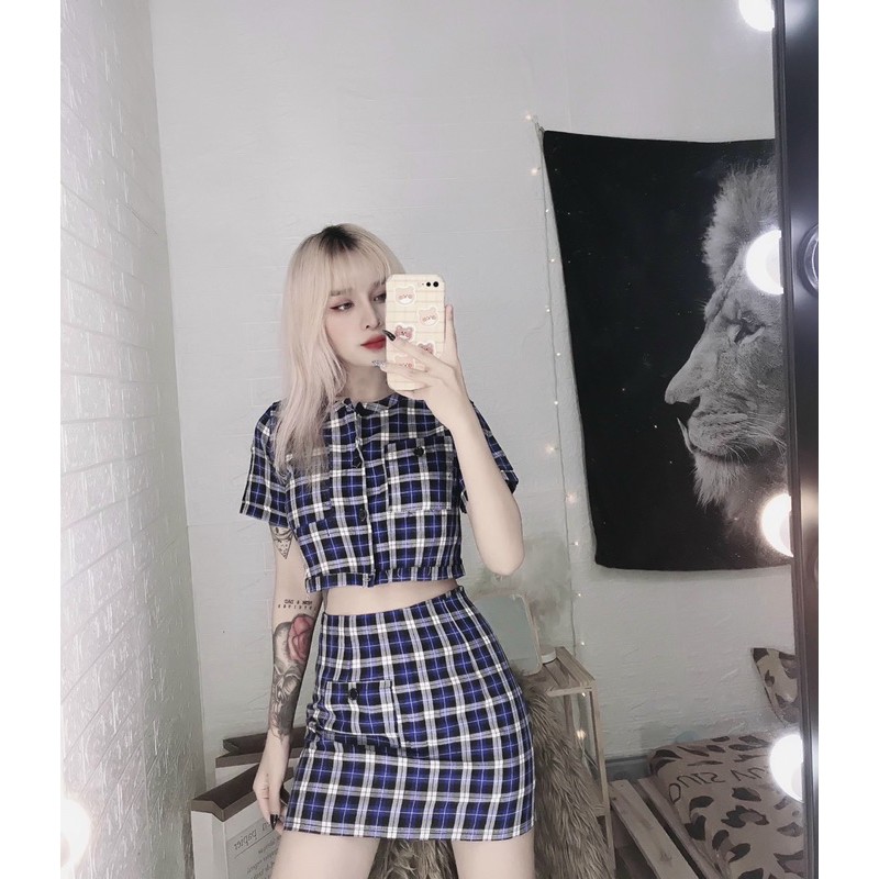 Giới thiệu Set bộ kiểu caro áo crop top chân váy ôm cá tính