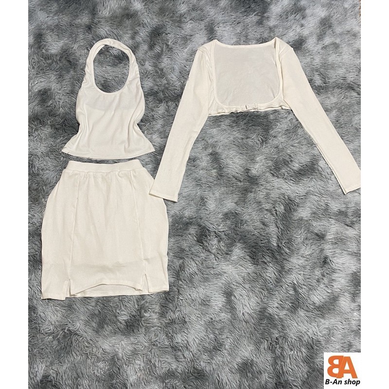 Giới thiệu Sét bộ nữ 3 món tay dài phối khóa gài áo + chân váy có quần trong chất vải thun gân len 4 chiều (Bảo An Shop) Hot
