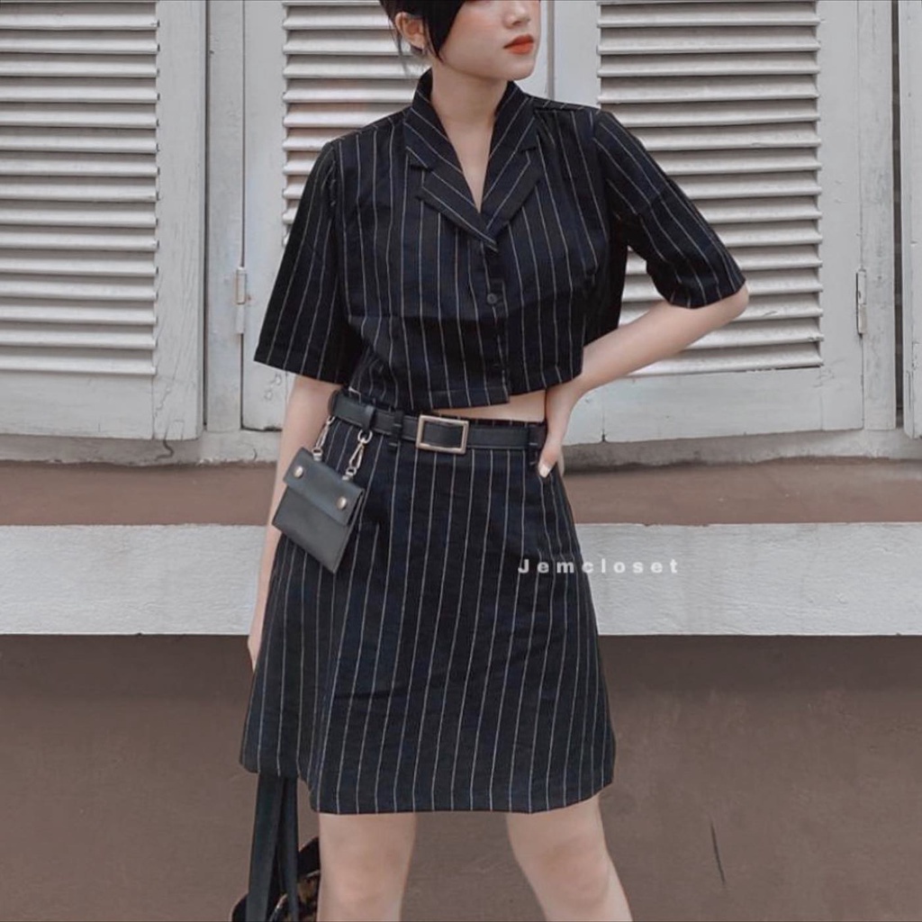 Sản phẩm: Sét Váy Nữ Jem Closet 8111 Set Chân Váy Áo Croptop MALL Kẻ Sọc 2 Màu Đen Và Hồng Lên Dáng Siêu Xinh Phong Cách Hàn Quốc