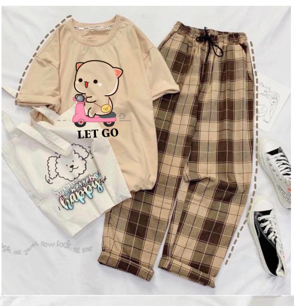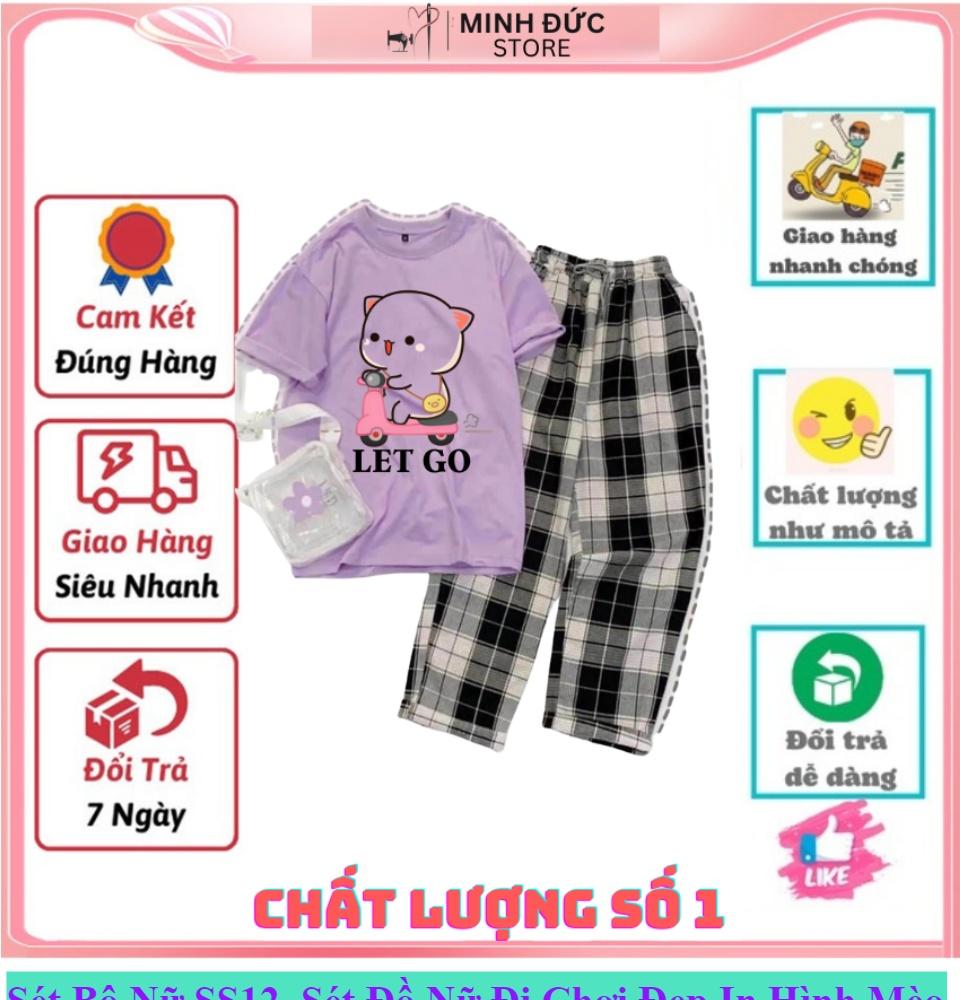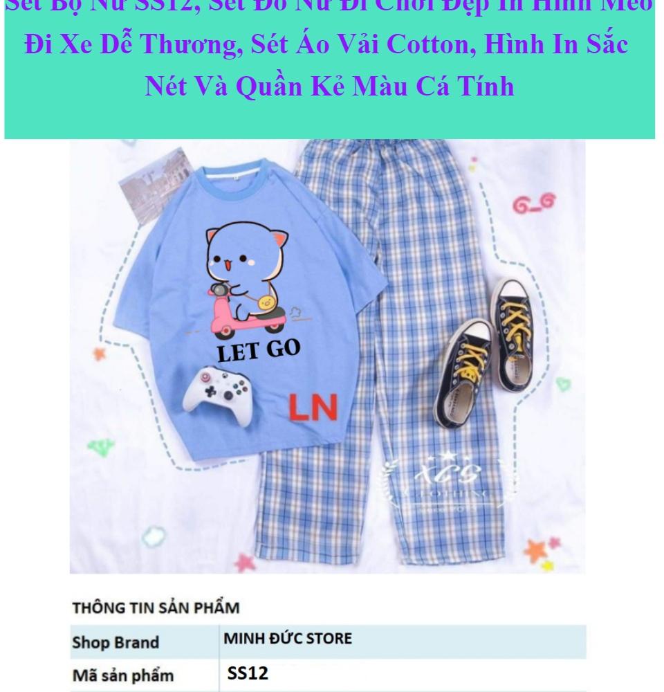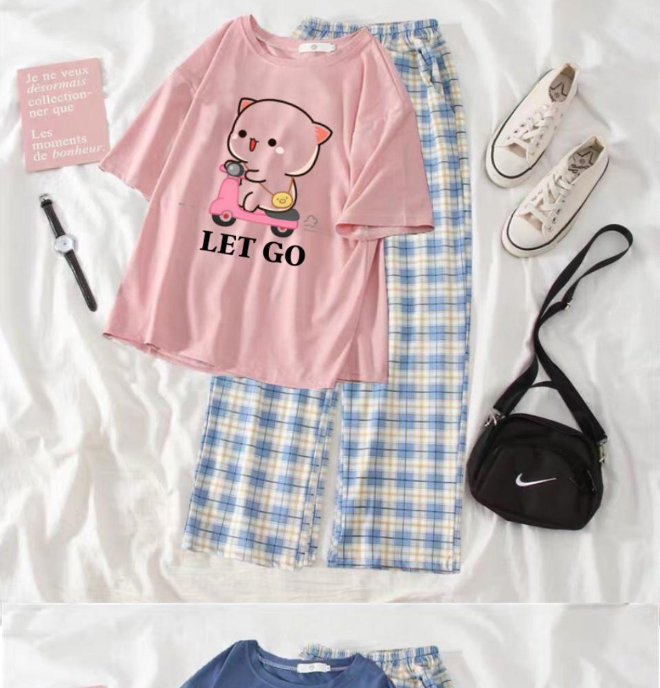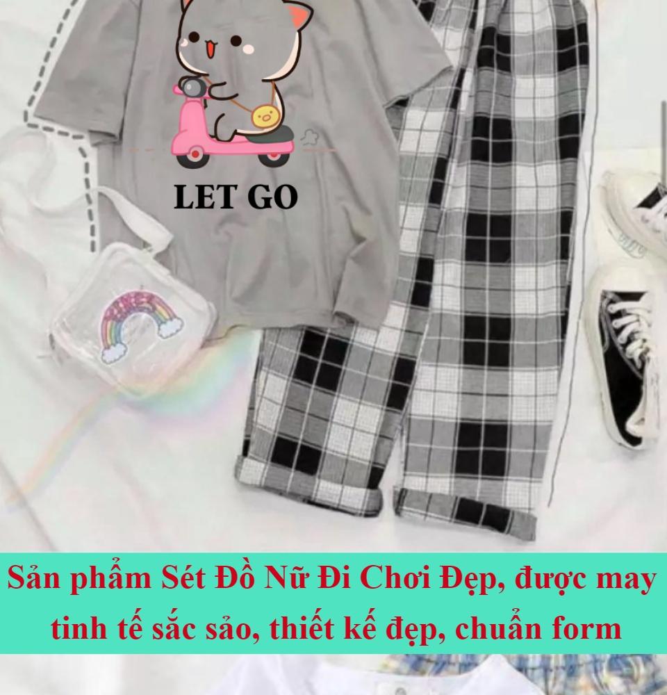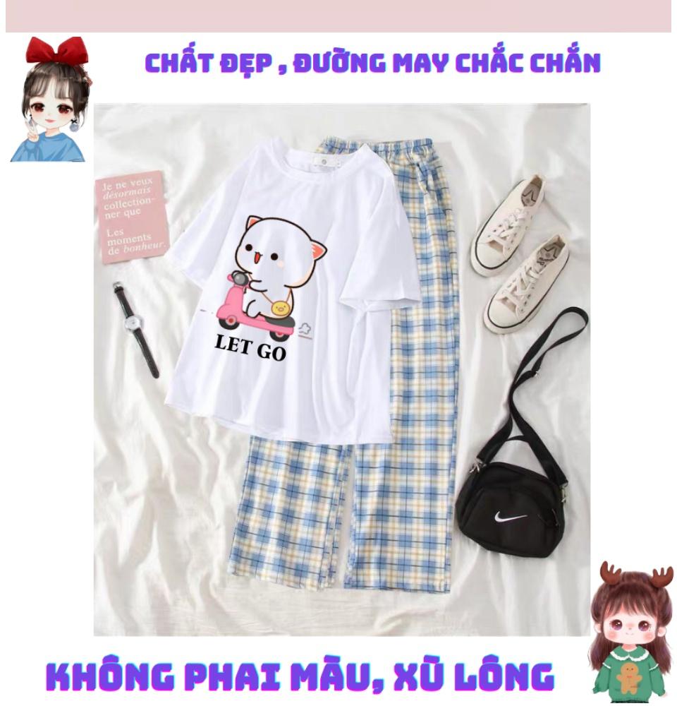Giới thiệu Sét Bộ Nữ SS12, Sét Đồ Nữ Đi Chơi Đẹp In Hình Mèo Đi Xe Dễ Thương, Sét Áo Vải Cotton, Và Quần Kẻ Màu Cá Tính - ÁO TRẮNG + Q.KẺ XANH