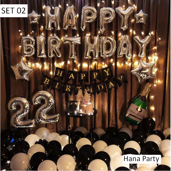***Lưu ý: QUÝ KHÁCH VUI LÒNG INBOX SỐ TUỔI (các set có số tuổi )VÀ TÔNG MÀU BÓNG ĐỂ SHOP LẤY ĐÚNG THEO YÊU CẦU CỦA QUÝ KHÁCH Ạ. NẾU QUÝ KHÁCH KHÔNG ĐỂ LẠI LỜI NHẮN, SHOP SẼ LẤY SỐ TUỔI VÀ MÀU BÓNG Y HÌNH Ạ. CẢM ƠN! SET BONG BÓNG ĐÈN LED BONG BÓNG TRANG TRÍ SINH NHẬT: 🥳 SET-01 GỒM: (vui lòng inbox shop nếu quý khách muốn thay đổi màu bóng) - bộ bóng chữ HPBD màu bạc - 1 dây đèn led dài 5m màu vàng - 1 bóng vương miện vàng to - 1 bóng mặt trăng vàng - 1 bóng trái tim 25cm vàng - 3 sao 25cm: màu vàng - 2 sao 12cm: màu vàng - 4 bóng trong suốt CÓ KIM TUYẾN BÊN TRONG - 30 bóng nhũ: 10 trắng, 10 vàng gold, 10 đen -Tặng: Bơm và keo dán bóng. 🥳 SET-02 GỒM: (vui lòng inbox shop nếu quý khách muốn thay đổi màu bóng và số tuổi) - Bộ bóng chữ HPBD màu Đen - 1 dây chữ HPBD ép kim đen gold - 1 dây đèn led dài 5m màu vàng (hoặc trắng) - BÓNG SỐ TUỔI màu bạc (vui lòng inbox shop số tuổi) - 01 bóng chai xanh to - 2 sao 45cm màu bạc - 2 sao 25cm màu bạc - 40 bóng nhũ: 20 trắng, 20 đen -Tặng: Bơm và keo dán bóng. 🥳 SET-03 GỒM: (vui lòng inbox shop nếu quý khách muốn thay đổi màu bóng và số tuổi) - Bộ bóng chữ HPBD màu Bạc - 01 dây chữ HPBD ép kim đen gold - 01 dây đèn led dài 5m màu vàng (hoặc trắng) - BÓNG SỐ TUỔI màu bạc (vui lòng inbox shop số tuổi) - 01 bóng chai xanh to - 02 bóng ly vàng nhỏ - 01 sao 45cm bạc - 01 sao 25cm bạc - 30 bóng trơn: 20 trắng, 10 đen -Tặng: Bơm và keo dán bóng. 🥳 SET-04 GỒM: (vui lòng inbox shop nếu quý khách muốn thay đổi màu bóng) - Bộ bóng chữ HPBD màu Bạc - 01 dây chữ HPBD ép kim Trắng gold - 01 dây đèn led dài 5m màu vàng (hoặc trắng) - 02 sao 45cm đen - 08 sao 25cm bạc - 06 sao 12cm bạc - 30 bong bóng nhũ: 15 trắng, 15 đen - 1 cuộn ru băng trứng nhũ bạc - Tặng: Bơm và keo dán bóng. 🥳 SET-05 GỒM: (vui lòng inbox shop nếu quý khách muốn thay đổi màu bóng) - Bộ bóng chữ HPBD màu Bạc - 01 rèm kim tuyến 1x3m màu vàng - 01 dây cờ Tam giác ép kim bạc - 01 dây đèn led dài 5m màu vàng (hoặc trắng) - 01 TRỤ BÓNG 7 CÀNH GIẢ BÓNG BAY - 01 chai xanh to - 02 sao 45cm: 1 vàng, 1 bạc - 02 sao 25cm vàng - 10 bóng Vân Đá màu Đen - 30 bóng nhũ: 10 bạc, 10 đen, 10 trắng - 01 cuộn ru băng nhũ bạc - Tặng: Bơm và keo dán bóng. 🥳 SET-06 GỒM: (vui lòng inbox shop nếu quý khách muốn thay đổi màu bóng) - Bộ bóng chữ HPBD màu trơn hồng nhạt - 01 dây cờ Tam giác ép kim hồng gold - 01 dây đèn led dài 5m màu vàng (hoặc trắng) - 02 sao 45cm bạc - 01 tim 45cm bạc - 02 sao 25cm bạc - 40 bóng nhũ: 20 hồng nhạt, 20 trắng - 01 cuộn ru băng nhũ bạc - Tặng: Bơm và keo dán bóng. 🥳 SET-07 GỒM: (vui lòng inbox shop nếu quý khách muốn thay đổi màu bóng) - Bộ bóng chữ HPBD màu trơn hồng gold - 01 dây cờ Tam giác ép kim hồng gold - 01 dây đèn led dài 5m màu vàng (hoặc trắng) - 3 bóng tim to hồng gold - 1 bóng mặt trăng bạc to - 10 bóng nhũ hồng gold - 20 bóng trơn đỏ đô - 1 cuộn ru băng nhũ bạc - 2 trụ bóng 7 cành giả bóng bay (nếu quý khách chọn set có trụ bóng) - Tặng: Bơm và keo dán bóng.