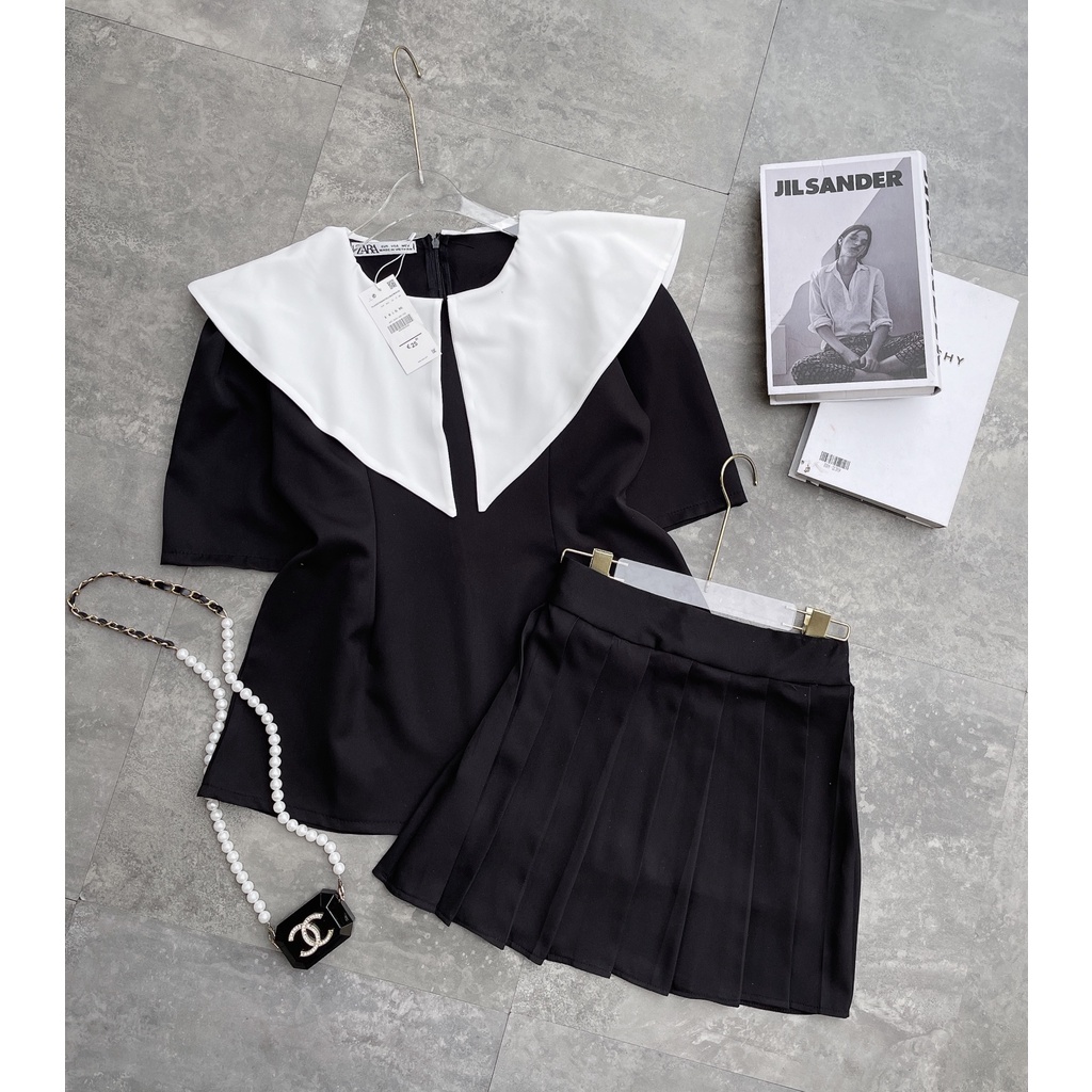 Giới thiệu Set chân váy cổ thuyền mix chân váy xếp li ngắn TL600