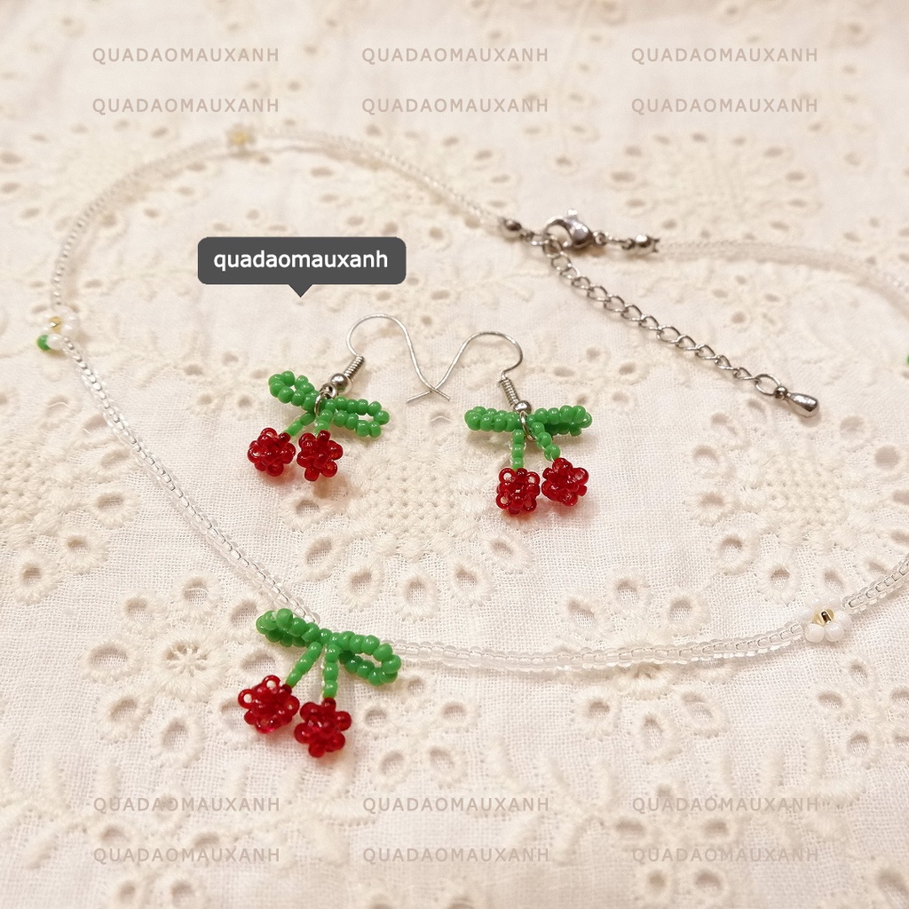 Phụ Kiện Thời Trang > Bộ phụ kiện || Set Cherry cổ điển, khuyên tai hình quả Anh Đào, vòng cổ choker [không co giãn] hạt cườm nhí trong suốt #Quadaomauxanh