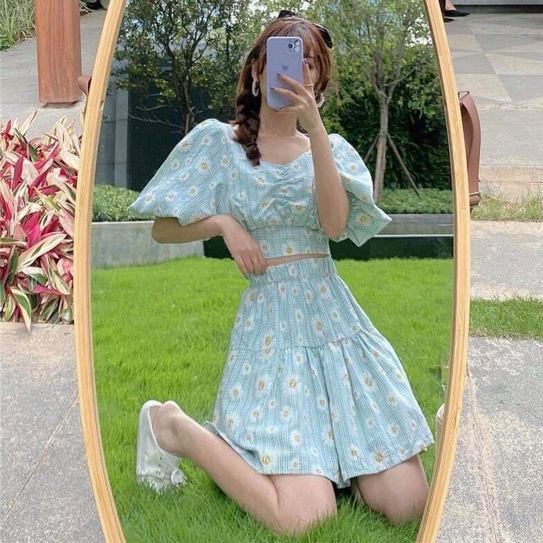 Kiểu dáng: áo croptop cổ vuông thuyền khoét V nhẹ , trước ngực có đường nhún bèo nhẹ nhàng tạo điểm nhấn, phía sau eo bo chun bèo KIỂU XỊN SÒ cực dễ mặc; tay bồng bềnh bo chun cực đẹp. Chân váy cạp chun 2 tầng xoè. Set dc in dệt hoa cúc caro nổi cực xinh