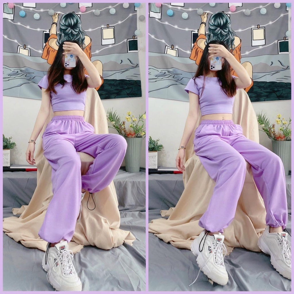 Set croptop tay ngắn + quần jogger dây rút trơn màu basic genz cryaotic10