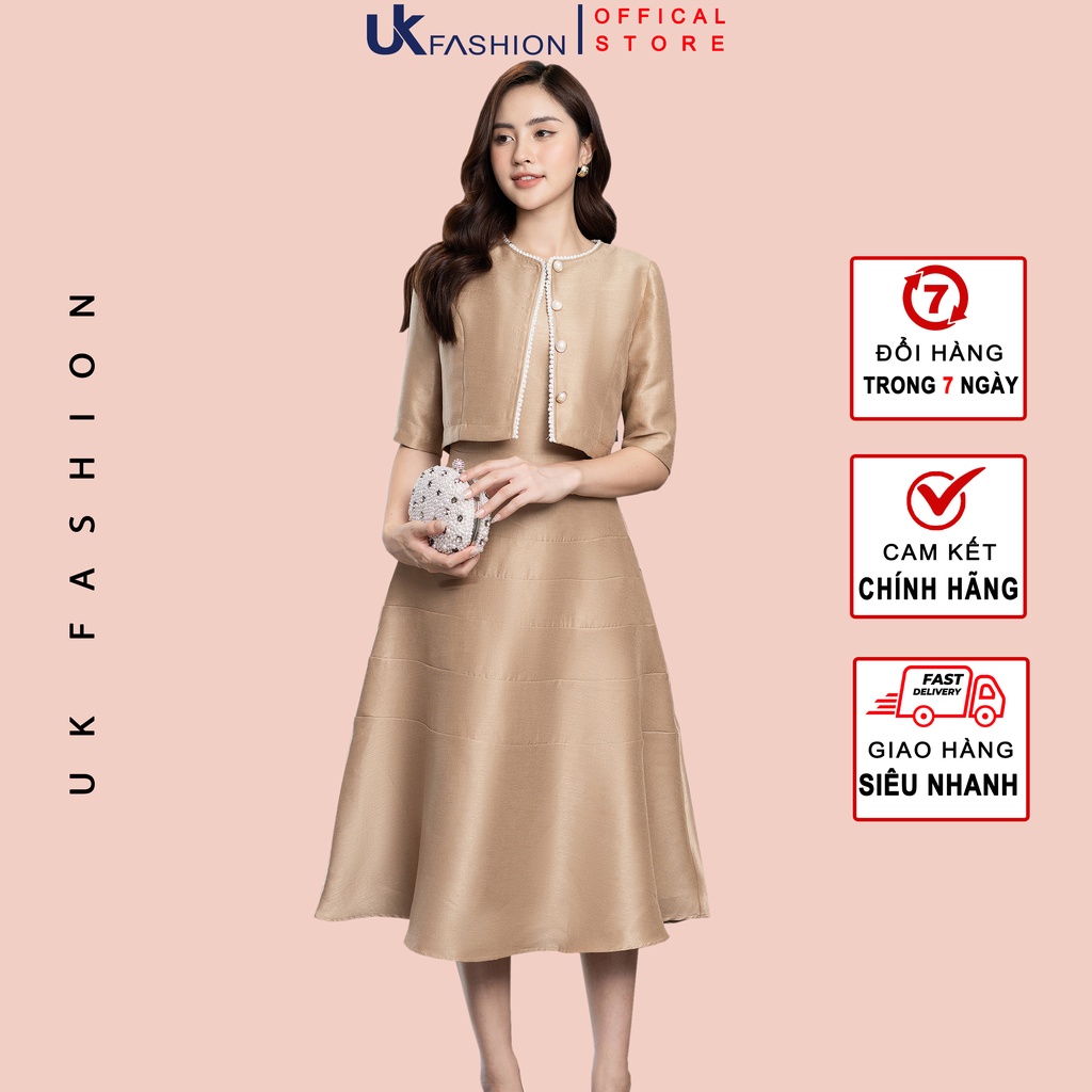 Tên sản phẩm: Set Đầm Dáng Xòe UK FASHION Áo Khoác Lưng Thiết Kế Đính Ngọc Cổ Tròn Tay Lỡ Vải Hàn Cao Cấp NKBD2208001