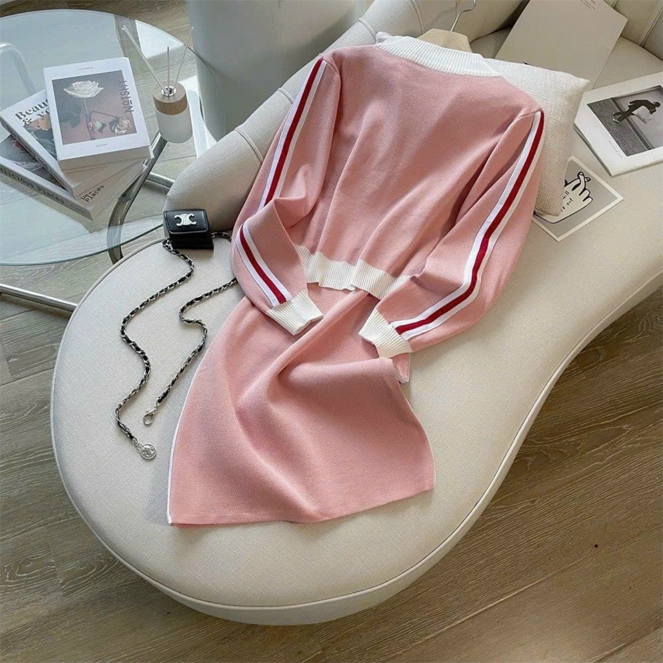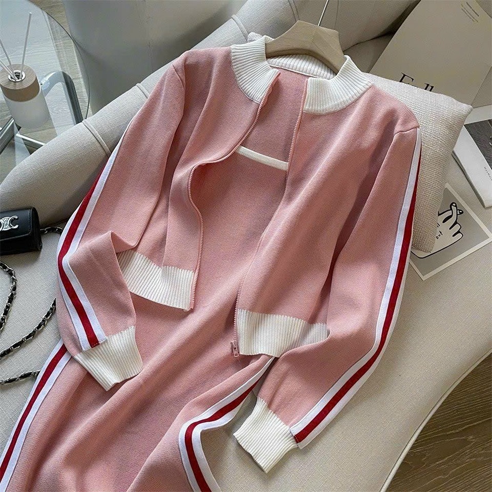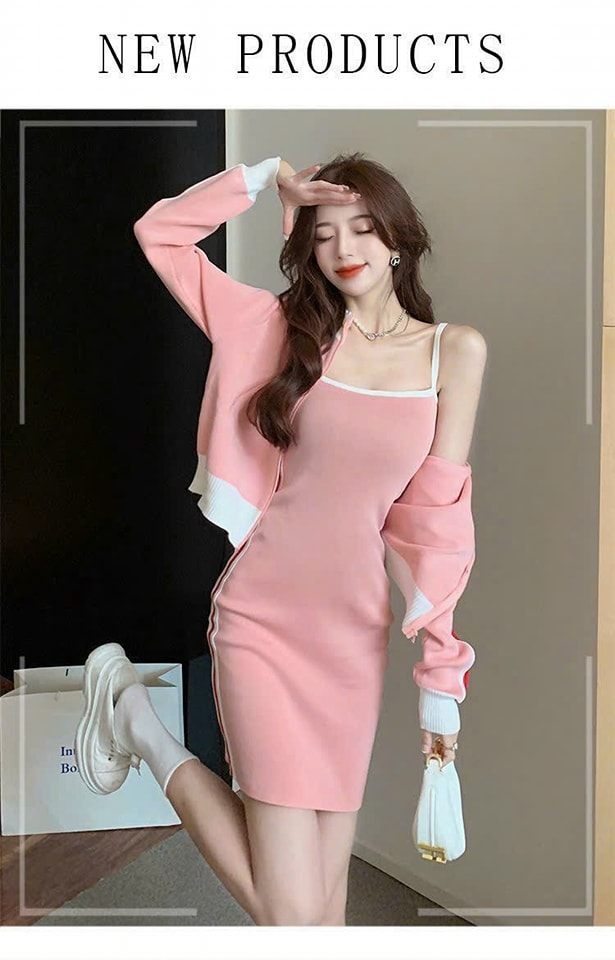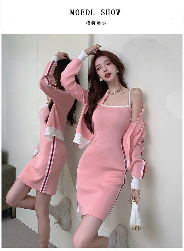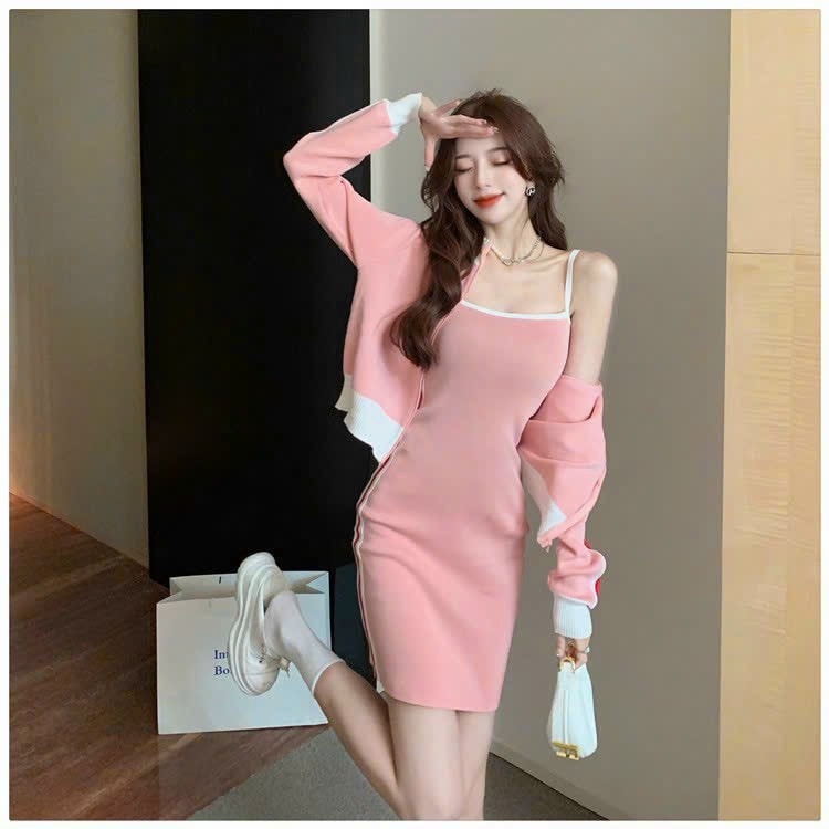 Set đầm len 2 dây kèm áo khoác len phối sọc