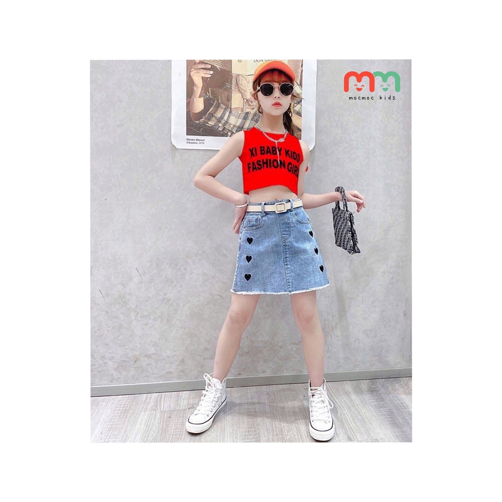 Set đồ bé gái dễ thương cá tính áo croptop 3 lỗ phối váy jeans có chip trong cho bé 13kg đến 43kg