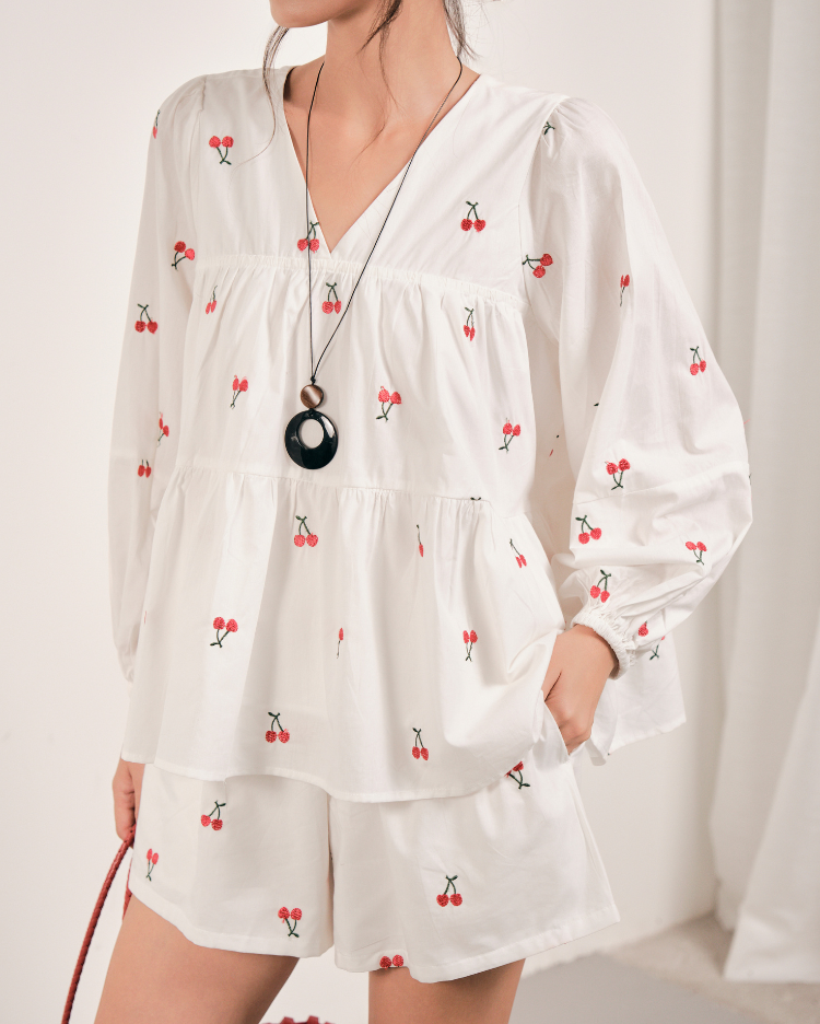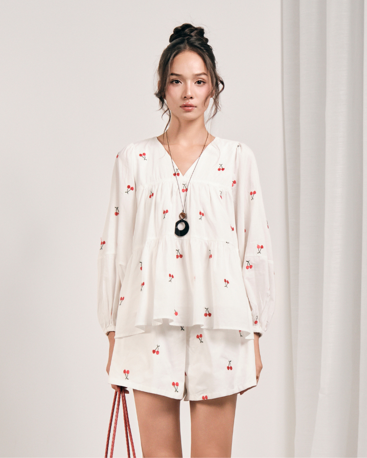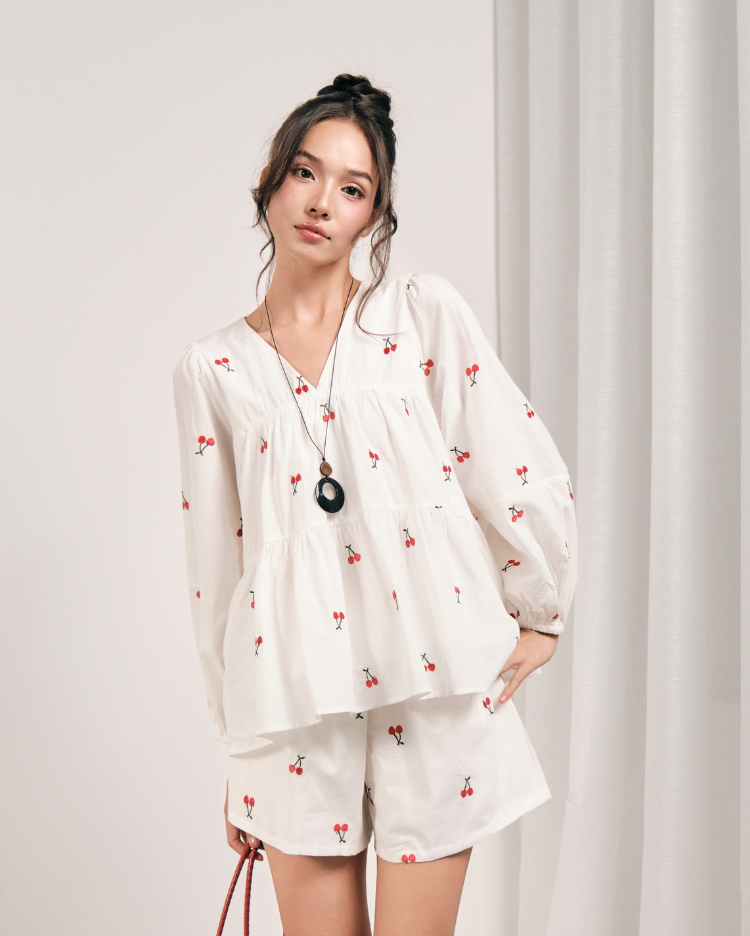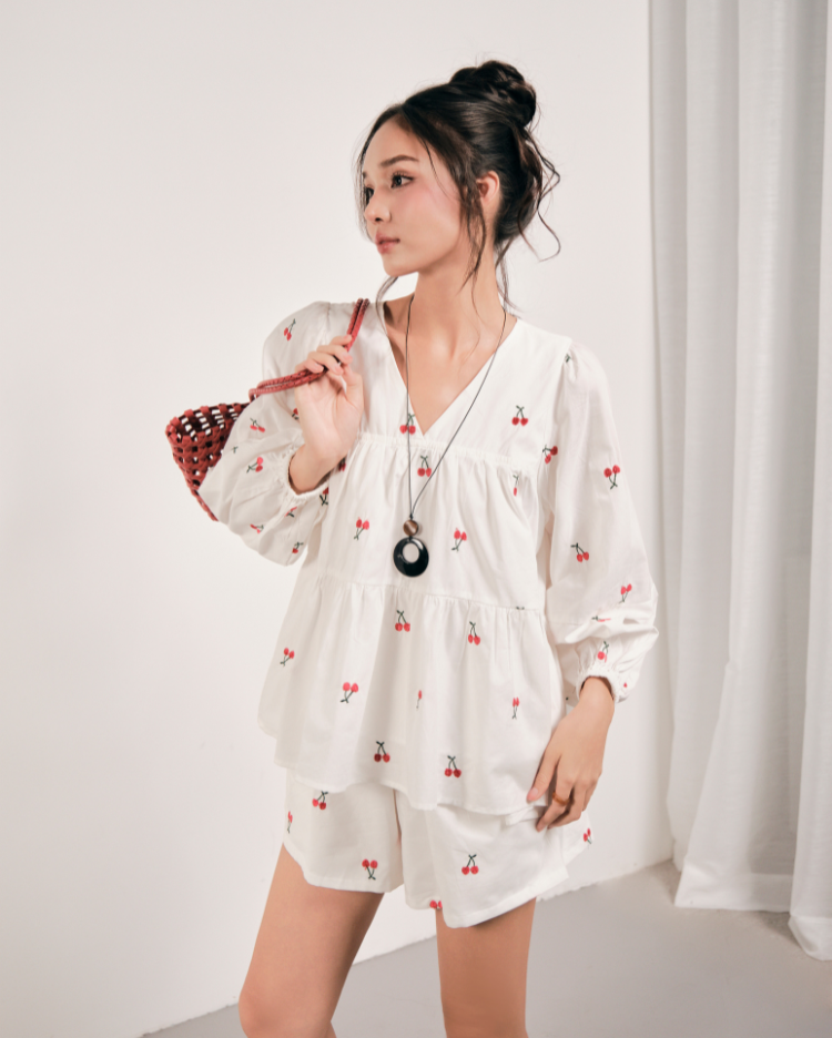 ✿ Sản phẩm : Set đồ bộ họa tiết trái gồm áo tay dài và quần short dễ thương Cherry Miều Est.2013