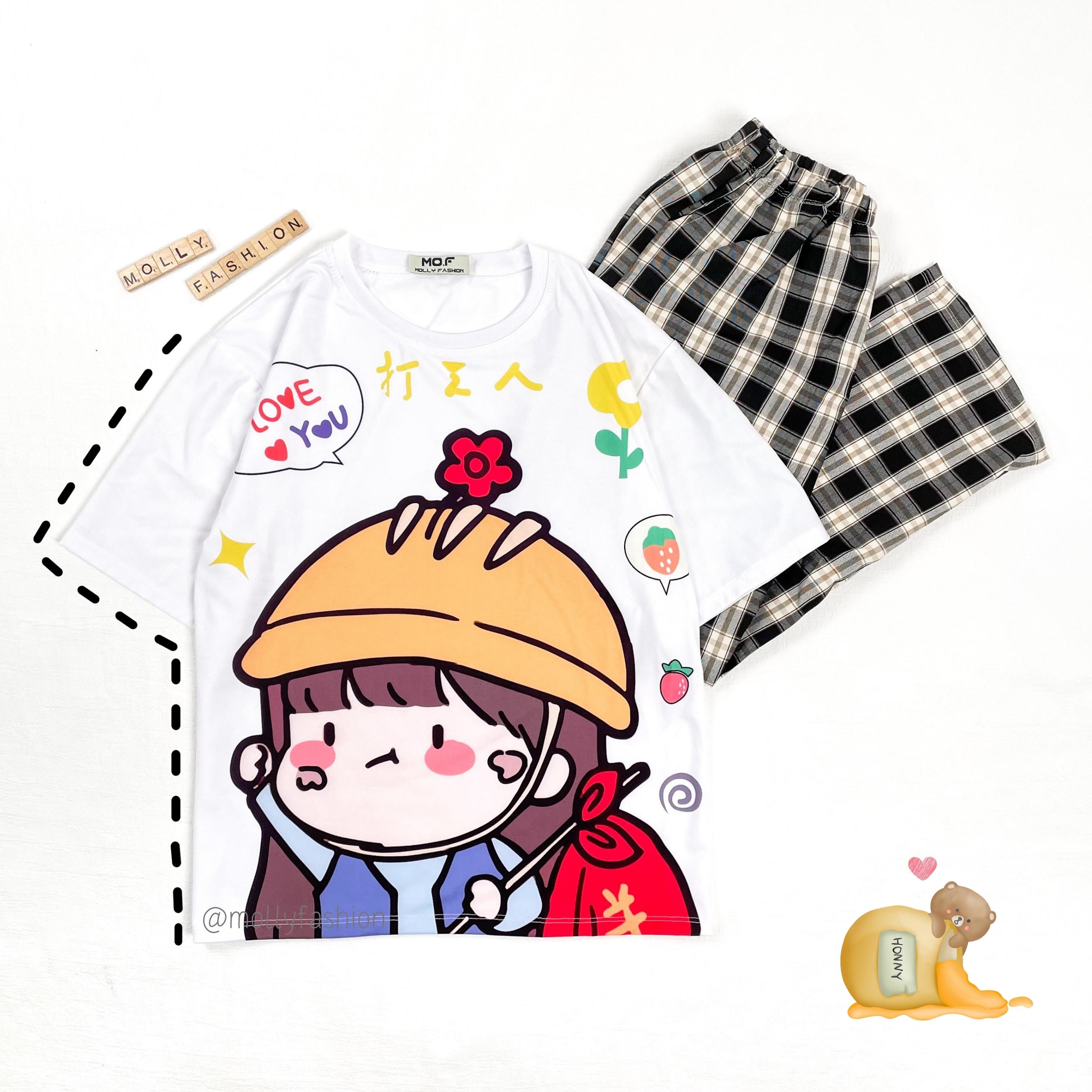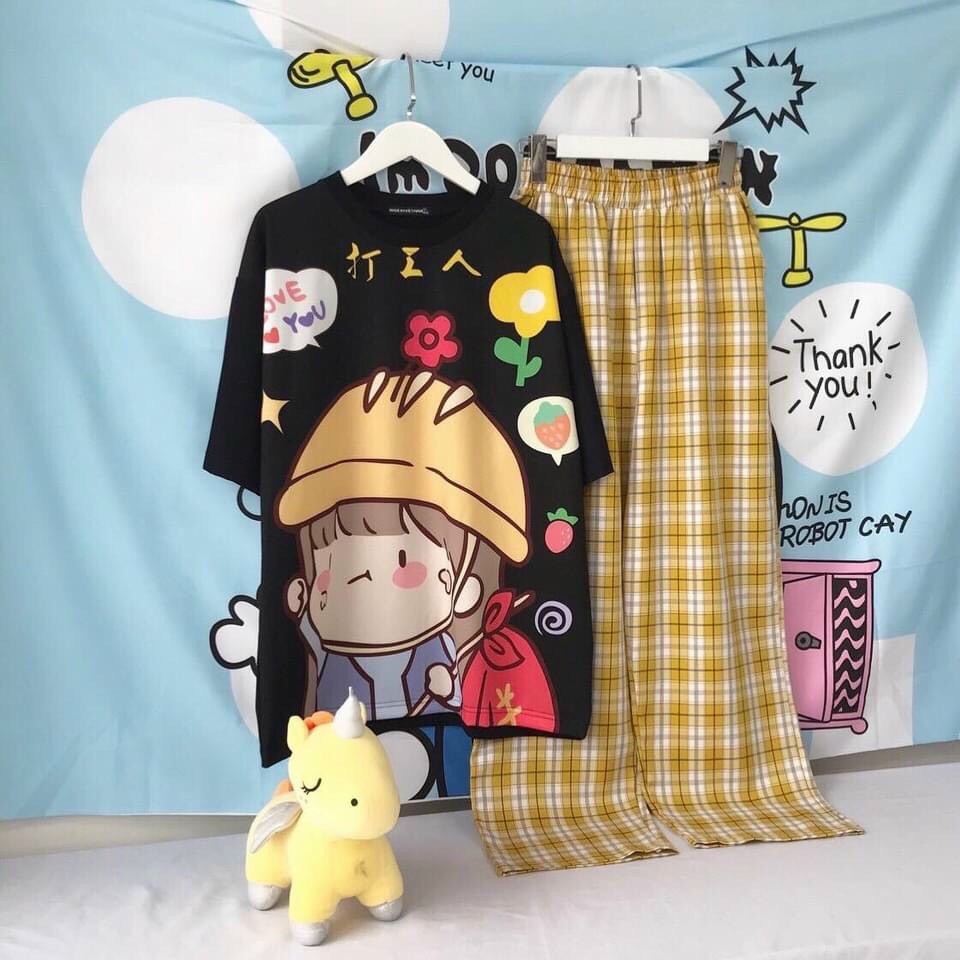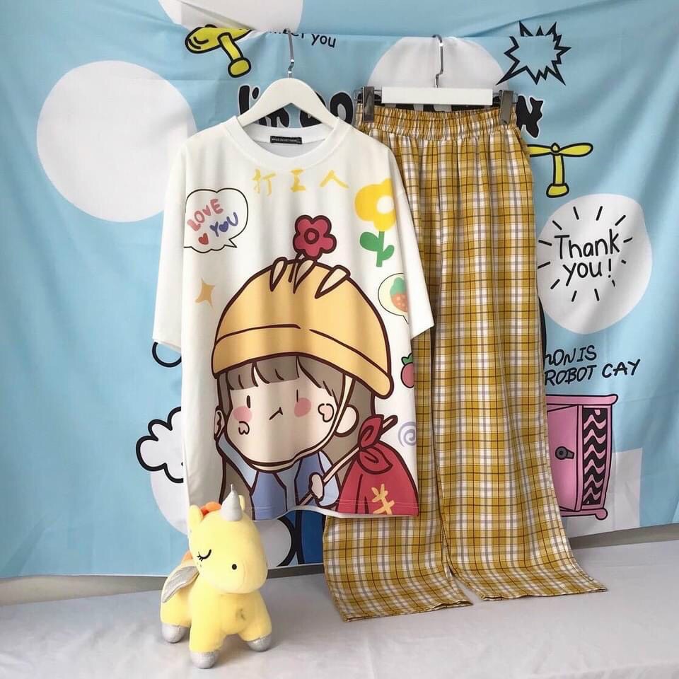 Set đồ gồm: 1 áo thun + 1 quần caro ống rộng