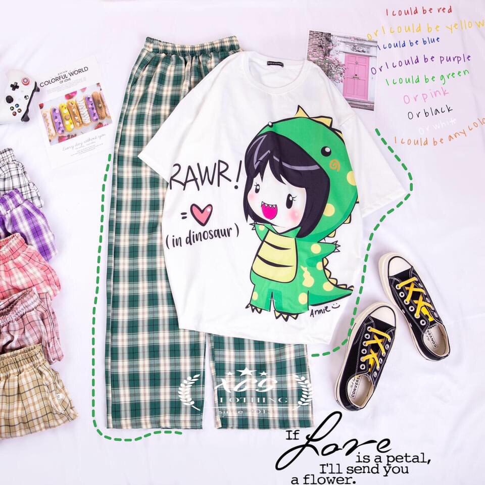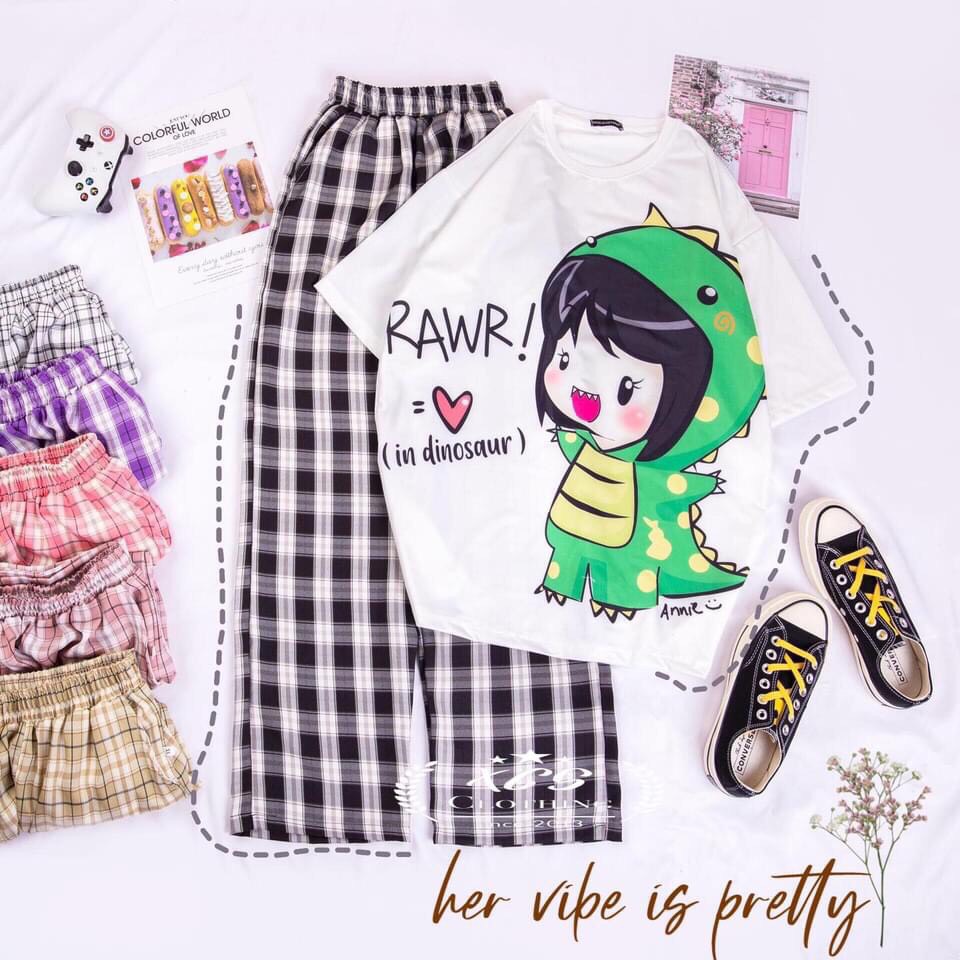 Set đồ gồm: 1 áo thun + 1 quần caro ống rộng
