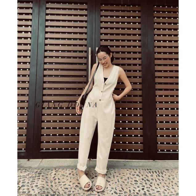 Giới thiệu Set jumpsuit tanktop kem cổ v nút nâu không tay kèm áo croptop 2 dây đen