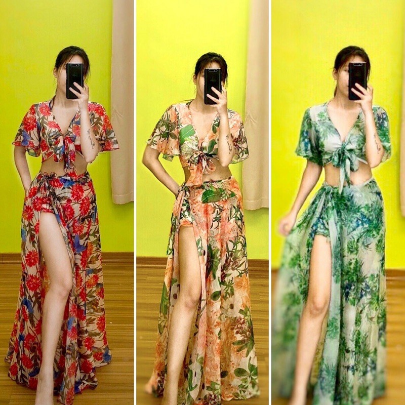 Giới thiệu Set maxi bikini 3 món hoạ tiết hoa vintage đi biển cực hot - Có ảnh thật